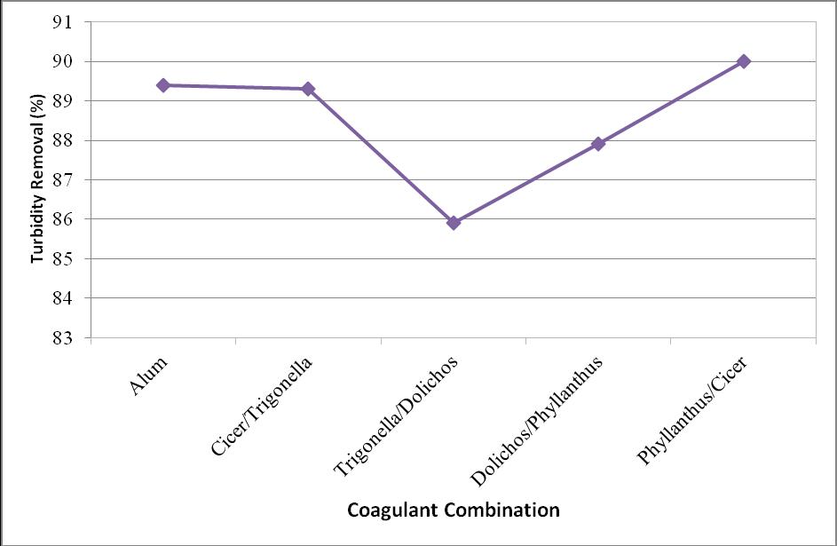 Figure 1. TurbidityRemovalEfficiency(%)ofAlumand BinaryBio-CoagulantCombinations.