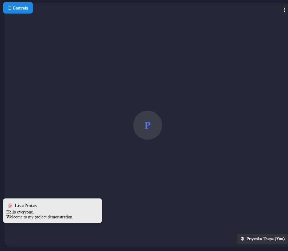 MeetSync creates reliable, low-latency, real-time video conferencing capabilities with the ZegoCloud SDK. A secure signaling system establishes a connection to ZegoCloud's servers when a user inputs a valid Room ID. Audio-video data transfer is supported by WebRTC (Web Real-Time Communication) protocols, which guarantee encrypted peer-to-peer streaming whenfeasibleandrelyonTURNserversforNATtraversal. Inordertoprovideaflawlessuserexperience,theZegoCloudSDKconstantlyadjustsaudioandvideoqualityinresponse to network disturbances. Additional features include in-room text chat for side conversations and screen sharing, which records and broadcasts a user's screen. As illustrated in Figure 1, participants have fine-grained control over their microphones,cameras,andabilitytoleavemeetingswithoutdisturbingotherparticipants.