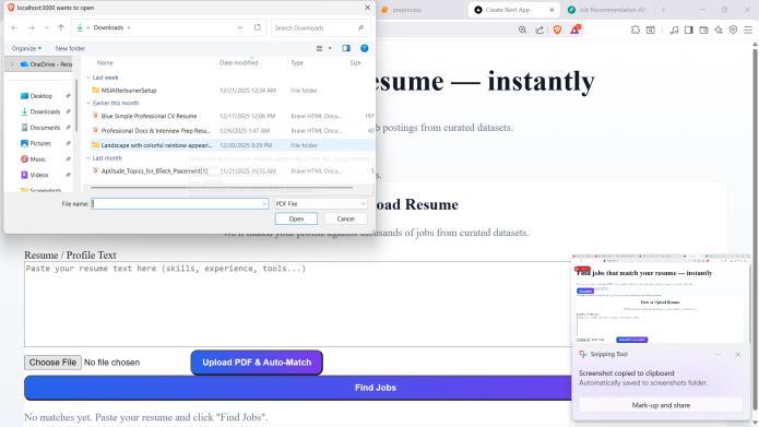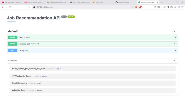 The backend of the system was developed using FastAPI, which exposes RESTful APIs for job recommendation. The backendloadstheprecomputedembeddingsandsimilarity indextogeneraterankedjobrecommendations.Thefrontend was developed using Next.js, providing a user-friendly interfaceforskillinputandresultvisualization.Thebackend servicewasexecutedusingthe Uvicorn server.