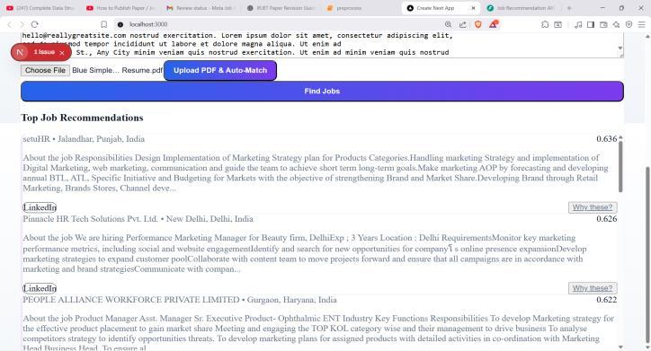 Althoughthecurrentimplementationoperatesonstructured andpre-collecteddatasets,itdemonstratestheeffectiveness of semantic similarity in job recommendation systems. Future work includes integrating real-time job data extraction from online platforms, incorporating advanced transformer-based embedding models, and implementing userfeedbackmechanismstoenableadaptiveanddynamic learning. These enhancements can further improve recommendationaccuracyandsystemperformanceinrealworlddeploymentscenarios.