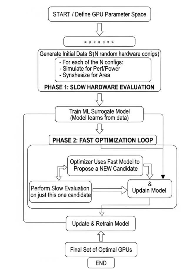 TheML-Surrogateframework isdesignedasa closed-loop system that automates the cycle of generation, evaluation, learning, and optimization. The process begins with an initialsetofconfigurationsfromtheGPUgenerator.These are evaluated for PPA, and the data is used to train surrogate models. A Bayesian Optimizer uses these fast models to propose new, promising configurations, which arethenevaluated.Thislooprepeats,allowingthesystem tolearnandimproveovertime.