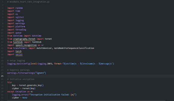 Moodyusesa mixoftechnologieslikespeech recognition, natural language processing (NLP), and machine learning to detect emotions from your voice and words. It’s built using a powerful emotion detection model (based on the Distil Roberta transformer), and it also talks back using text-to-speech, making the interaction feel natural. All conversations are saved securely in an encrypted local database, so it respects your privacy. One of the coolest features of Moody is the heart rate sensor. By checking your pulse in real time, Moody can tell if you’re feeling anxious or overwhelmed even if you’re not saying it out loud. If it notices a high heart rate and negative emotions like sadness or anger, it gently suggests calming activities like breathing exercises or offers comforting responses. These small actions can make a big difference when someone is having a tough moment. The system also includes an Arduino setup that responds physically using things like LEDs, buzzers, and vibration motors. For example,aredLEDmightlightupwhenyou’reangry,ora softvibrationmightguideyouthroughbreathingexercise. This kind of feedback makes Moody more interactive and helpful, especially for users who prefer visual or physical cues. Overall, our goal with Moody is to show how combining AI and simple hardware can create a low-cost, accessible emotional support tool. As first-year students, this project helped us learn how to apply what we’ve studied in a real-world way that could actually help people. In this paper, we’ll explain how we built it, how it works, and why it could be useful for anyone needing a littleextrasupportintheirday.