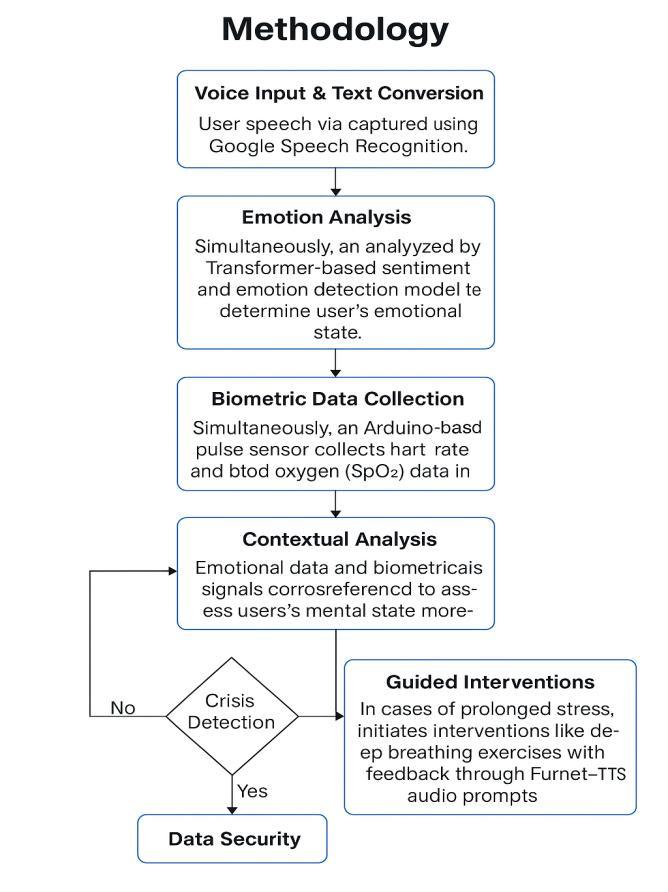 The process begins with the user’s voice input, which is capturedviaamicrophoneandconvertedintotextusing theGoogleSpeechRecognitionAPI.Thistranscribedtext is then analysed using a Transformer-based sentiment analysis model (Distil Roberta) to classify the user’s emotional tone such as sadness, anger, happiness, or neutrality. In parallel, a pulse sensor connected to an Arduinoboardcontinuouslyrecordstheuser’sheartrate andoxygensaturation(SpO₂)levels.Thesephysiological parameters are processed in real time, and any significantdeviation suchasaheartrateexceeding100 bpm mayindicateanxiety,stress,oremotionalarousal.