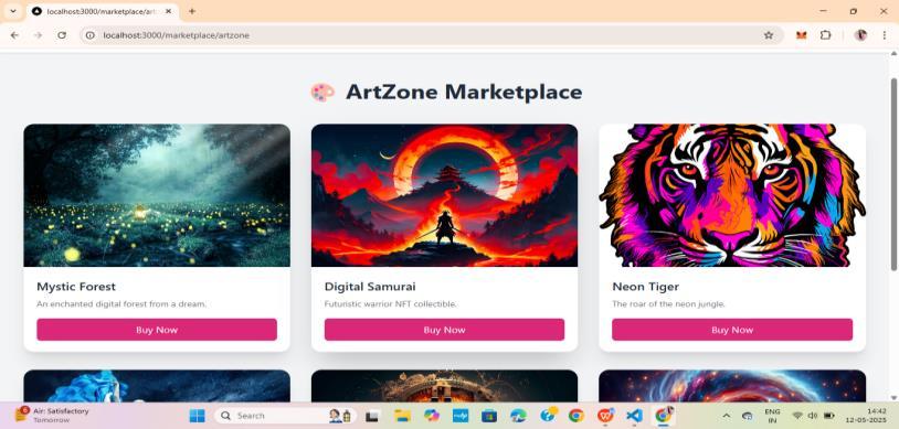 The developed NFT marketplace successfully integrates core blockchain features such as minting, listing, buying, selling, andtransferringNFTsusingsmartcontractsontheEthereum blockchain (or relevant testnet like Rinkeby/Polygon). The followingkeyfunctionalitieswereobserved: