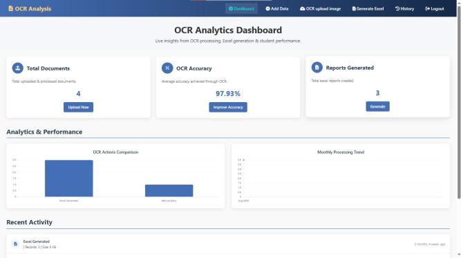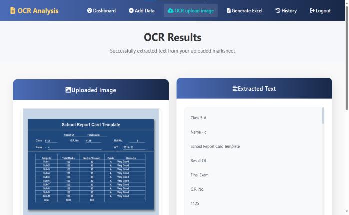 TheOCRResultAnalysisSystemisdesignedtoautomatethe management of student records and academic reports by utilizingOpticalCharacterRecognition(OCR)technology.It allowsuserstosecurelyloginandregisterbeforeaccessing features that let them manually input student details or uploadscannedmarksheetsforOCRprocessing.Thesystem then stores the extracted data in a structured database, enabling efficient and accurate result generation. Result sheetsareautomaticallycreatedinExcelformat,simplifying analysisandreportsharingforteachersandadministrators In addition to result generation, the system includes a HistoryModuletorecordactionssuchasOCRuploads,result sheetgeneration,andfiledownloads.Thismoduleensures transparencyandaccountabilitybyallowingeasyretrievalof previouslygeneratedfiles.Byautomatingmanualtasks,the systemsignificantlyreducesworkload,improvesoperational efficiency, and provides a reliable, secure solution for schools,colleges,anduniversitiestomanagestudentrecords andgenerateacademicreports.