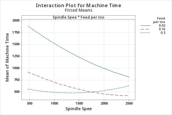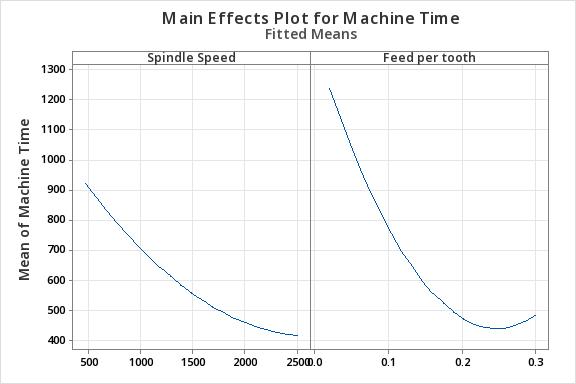 The main effects plots (Fig. 4) show a non-linear relationship between spindle speed - machining time and feed per tooth – machining time. The higher slope of the feed per tooth w.r.t. machining time indicates that an increase in feed rate contributes more to the reduction in machining time compared to an increase in the spindle speed.