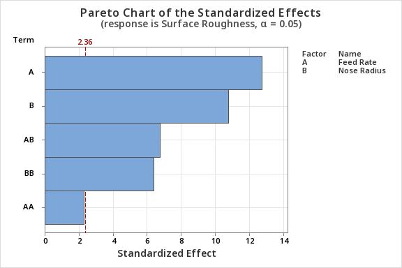 The Pareto chart (Fig. 7) shows that feed per tooth, nose radius, interaction of feed per tooth and nose radius, and squareofnoseradiusaresignificantatα=0.05.
