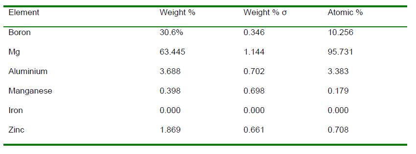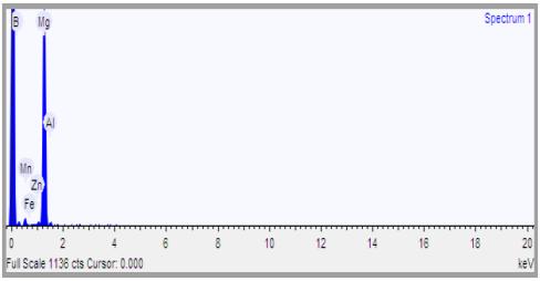 TestofmaterialreinforcedwithB4C+MgOisdonehere. Composition of Boron and Mg can be seen from graph. There is also the presence of Mn and Fe is there due to thecompositionpresentinthebasemetal.