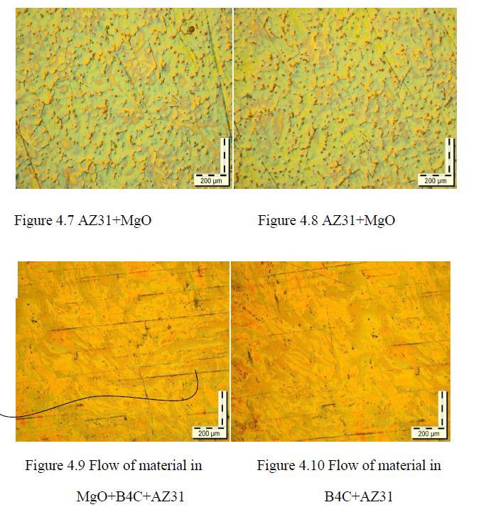 Thefiguredisplaysthemicrostructureofthemagnesium alloy'sFSPatvariousrotationalspeedsandwithvarying reinforcement materials. The uniform mixing of reinforcedparticlesinthemagnesiumalloy's basemetal isshowninFig4.1-4.10