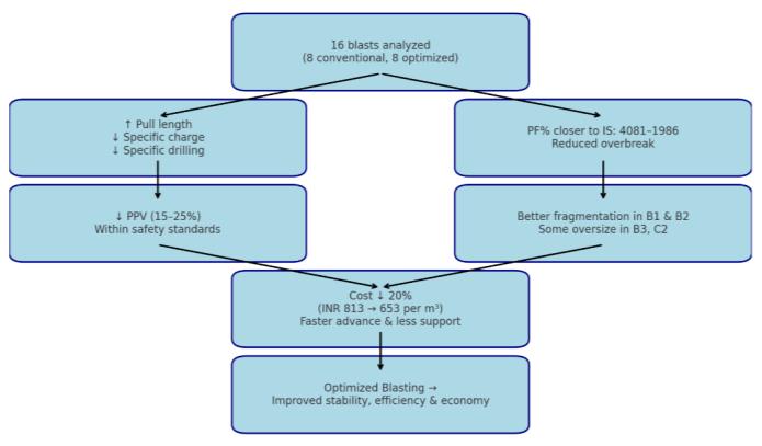 useofoptimizeddrillingandblastingtechniquesimproved fragmentation,reducedoverbreak,andincreasedefficiency. Theapproachresultedinabout20%costsavings,making tunnelingintheHimalayasbothsaferandmoreeconomical. Theresultsfurtherindicatedthatcarefuldesignofblasting parametershelpstocontrolvibrationandflyrock,whichis important in sensitive terrains. In addition, longer pull lengthsreducedthenumberofblastcycles,whichhelpedto savetimeandresources.Fewerdrillholesloweredtheuseof consumables and reduced equipment wear, cutting down operating costs. Better fragmentation also improved muckingandhaulingoperations,leadingtofasterexcavation cycles. Together, these findings highlight that optimized blastingoffersbothtechnicalreliabilityandstrongeconomic valuefortunnelingprojectsincomplexgeologicalsettings.
