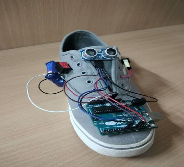 The hardware configuration uses the Arduino Uno microcontroller due to its simplicity of programmability, enough processing power, and compatibility withabroad rangeofperipheralsensors. AnHC-SR04ultrasonicsensor onthefrontoftheshoe measures the area in front of the wearerbyfiringultrasonicwavesandmeasuringthetimeof return. The system calculates the distance of the wearer from the possible obstacles on the basis of the time-offlightconcept.