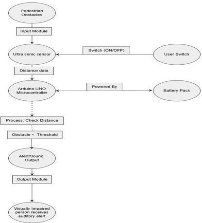 On an obstacle coming in close proximity, the Arduino triggers the buzzer, which modulates its brightness based on proximity. This instant feedback informs the user of surrounding dangers. The output module consists of the buzzer or other alerting devices, which send clear, immediatesignals.Lastly,theblindindividualreceivesthe sound signal, which enables safe movement and enhances their mobility andindependence.