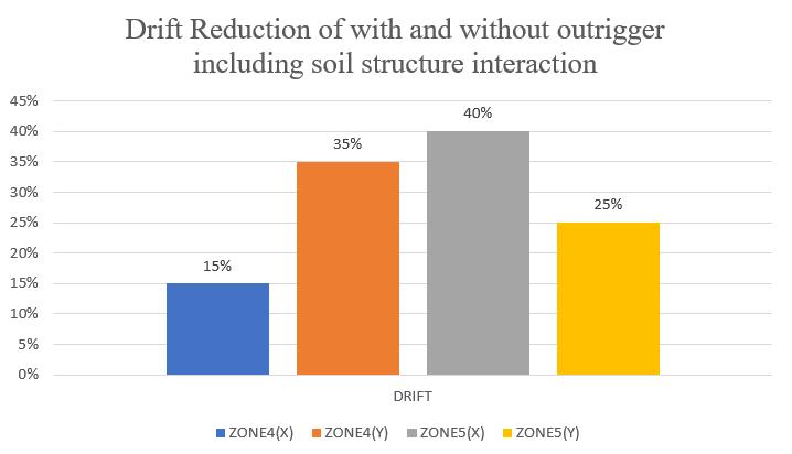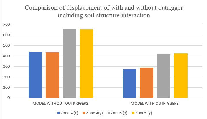 Themaximumstoreydisplacementofthestructureisin Y-direction. Hence the results are taken in Y-direction for zoneIV&zoneVwithsoftsoilcondition.Storeydisplacement variations are shown in chart below. The inclusion of fullheightoutriggersresultedinan80%reductionintop-story displacement. Structures without outriggers exhibited excessivelateralmovement,makingthemvulnerableduring earthquakes.