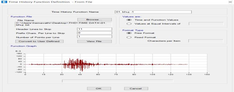 Non-linear time history analysis is a dynamic analysis method used to evaluate the seismic performance of structures under real earthquake ground motions. Bhuj Groundmotionisconsideredforanalysis.