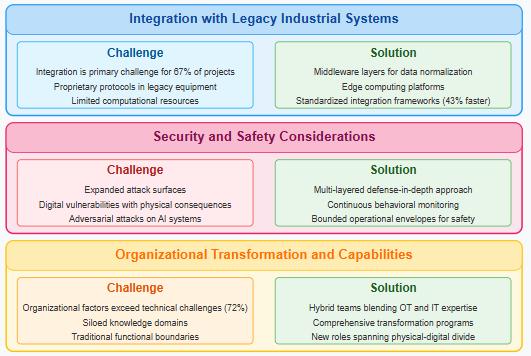 TheimplementationofPhysicalAIwithinestablishedindustrialenvironmentspresentssignificantintegrationchallengesthat must be systematically addressed to realize its full potential. According to comprehensive analysis, organizations deploying advanced AI in physical environments report that systems integration represents the primary implementation challenge for 67%ofprojects,withintegrationcomplexitiesextendingtimelinesbyanaverageof8.4monthscomparedtoinitialprojections [7]. This integration complexity stems from multiple factors, including proprietary communication protocols in legacy