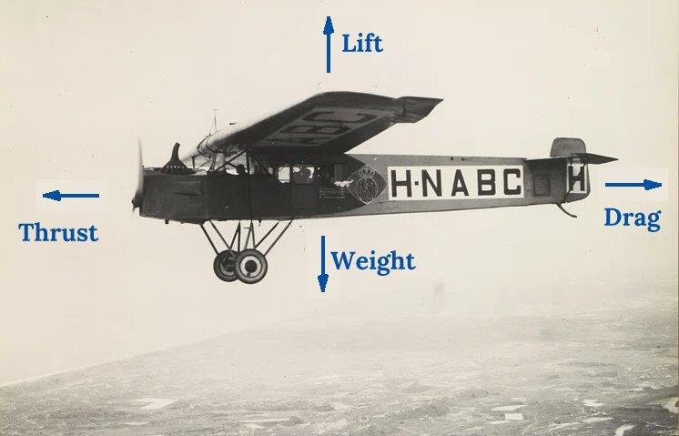 Thrust is the forward force generated by the aircraft’s engines either propellers or jet turbines that propels the airplanethroughtheair.Theamountofthrustdetermineshowfasttheairplanemoves.Itmustovercome drag,whichis theaerodynamicresistance opposingmotion. Dragisinfluenced byairspeed,airdensity,andtheairplane’sshape,andis givenby: