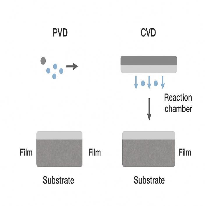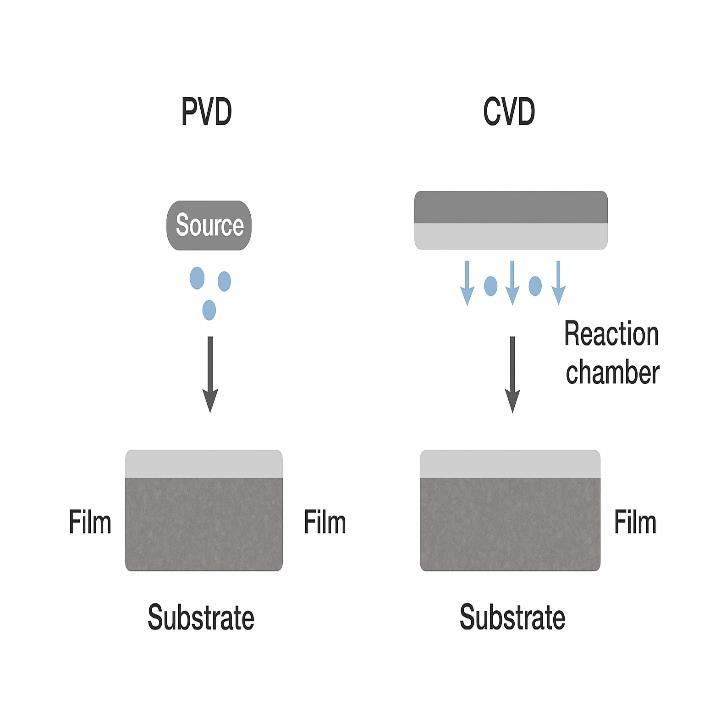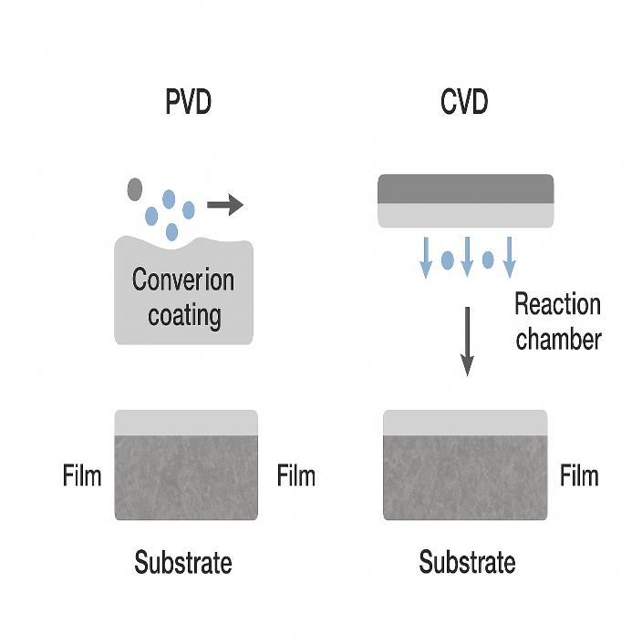 PVD and CVD techniques produce hard, dense coatings such as TiN, CrN, and AlTiN. Plasma-assisted versions en- hance coatinguniformityandadhesion.Thesearewidely usedinaerospaceandtoolingapplicationsduetotheirhighdurability [3].