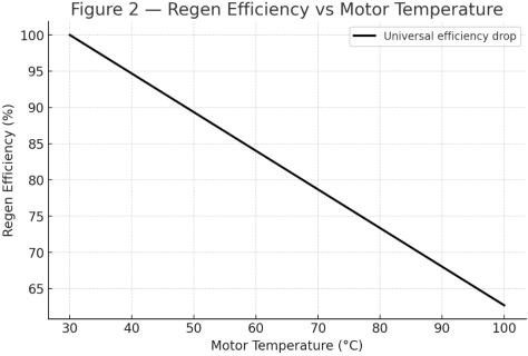 ● Regen Efficiency vs. Motor Temperature: The motor’s electrical resistance increases with temperature,soregenefficiencytypicallyfallsasthe motorheats.In Figure 2,weplotregenefficiency(in %) on the y-axis against motor temperature on the x-axis.Efficiencystartsat105%(at30°C)anddrops to~68%by100°C.