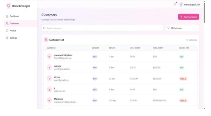 The customer list interface (Figure 4) provides a tabular and searchable view of all registered users along with theirchurnanalytics.Eachrowtypicallyincludes: