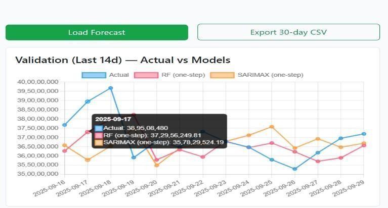 Once the data becomes usable, it is fed into two forecasting models: SARIMAX and Random Forest. SARIMAX works by studying time-based patterns such as trends, seasonality, and the effect of outside factors. It is helpful in understanding repeatedbehaviorslikeweeklypeaksorfestival-timespikes.RandomForest,onthe otherhand,learns bycreatingmany decision trees and combining their outputs. This helps it capture non-linear patterns and sudden changes in traffic that simplestatisticalmodelsmightmiss.