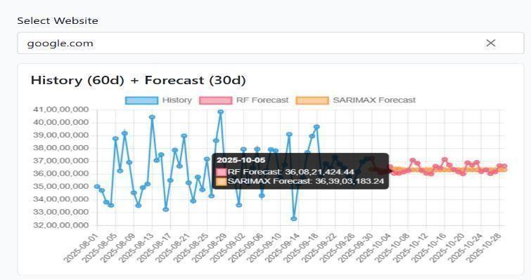 In our project, Users have several options to explore website traffic forecasts based on data from the past 60 days. The platform offers forecasts generated by both the Random Forest algorithm and the SARIMAX model enables straightforwardcomparisonofhowwelleachperforms.