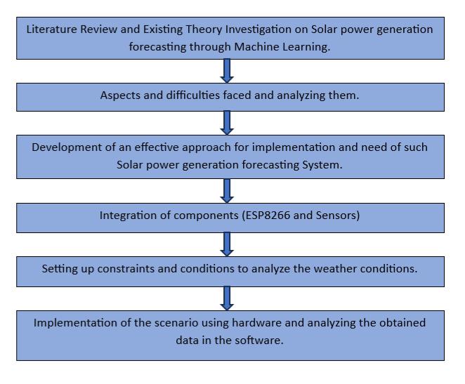 We first conducted a literature review and theoretical researchwithintheShort-TermIrradianceForecastUsing Numerical Weather Prediction. We then analyzed the challengesanddevelopeffectiveapproachestoimplement suchsolarpowergenerationforecastingsystems.Thenwe connect components like ESP8266 and some sensors. We developed this model to identify constraints and conditionstoanalyzetheweatherconditions.