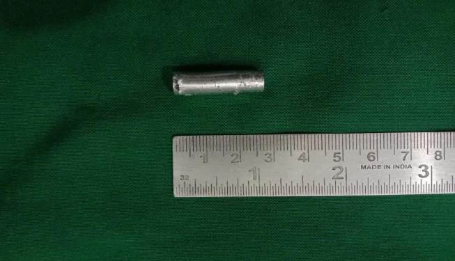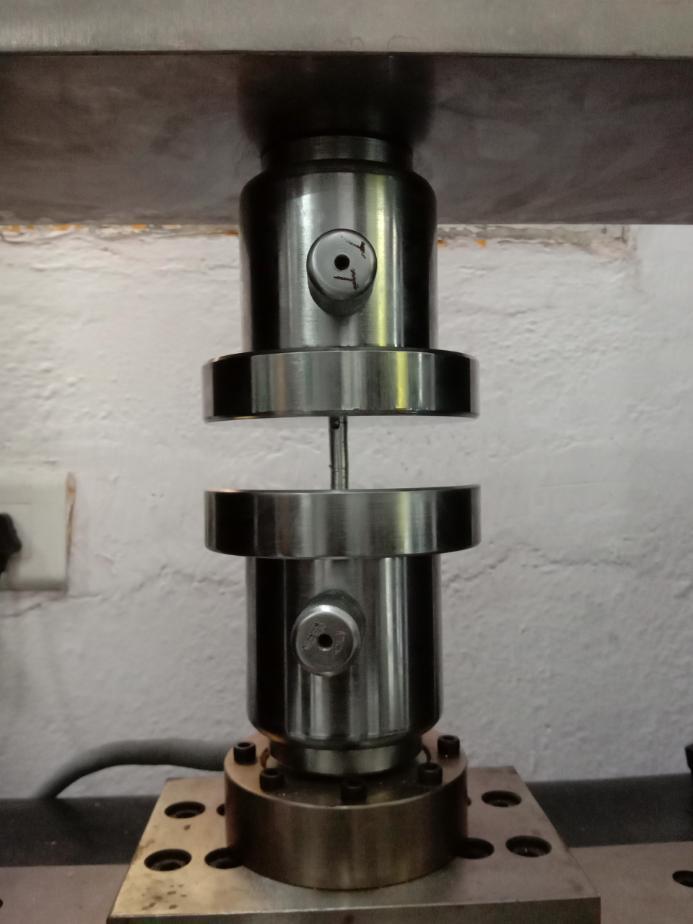 Thetestingsample8x30mmdimensionhasbeenmachined. The sample is fixed in to the Universal Testing Machine(UTM). Manual control switch is ON and the compressionloadisappliedtothesample.Duetotheeffect ofappliedloadthesamplegetsdeformed.Whenitgetsattain maximum,samplegetsreducedinitsoriginallengthandthe readingshasbeendisplaypanelofUTMmachine.
