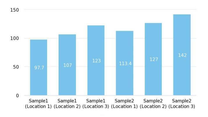 Wearefixafirstlocationforhardnesstestinginsample1. Aftertestingthesample1attheloadof0.5kgfwithdiamond intender,thefirstlocationvalueis97.7HV.Nowwearegoing to fix second location for finding better result. As same sample 1, at location 2, we get the value of 107 HV. The secondlocationhasbithighervaluethanfirstlocation.Then sample 1 at location 3, the value is 123 HV. And it is the highestvaluethancomparetofirstandsecondlocation.