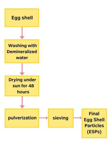The egg shell used in the study were collected from local households. Then the egg shells were thoroughly washed withdemineralizewatertoremoveanyforeignobjectsand thethinoutermembrane.Thecleanedeggshellswerethen dried under sunlight for 48 hours to ensure complete removal of moisture. After dried, the egg shells were pulverized using a grain miller operating at 400rpm to produceafinepowder.Thispowderwassievedofrequired sizetoobtaineggshellparticlesofuniformsizedistribution.