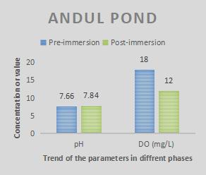 Of the two ponds, lower DO value was observed in Andul pond. The DO level has also come down during the postimmersionphaseindicatingpossibleinfluxoforganicmatter intotheponds.ButtherehasbeenslightchangeinthepH value in the pond water both in pre-immersion and postimmersionphases.