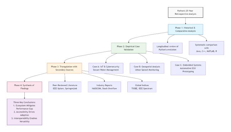 This study employs a mixed-methods, retrospective analytical framework to deconstruct the strategic ascendancy of the Python programming language over a twenty-five-yearperiod(2000-2025).The methodology is designedtotriangulatefindingsthroughtheintegrationof historical analysis, comparative benchmarking, and empirical case evidence, thereby providing a holistic and validatedperspectiveonPython'sdominance.