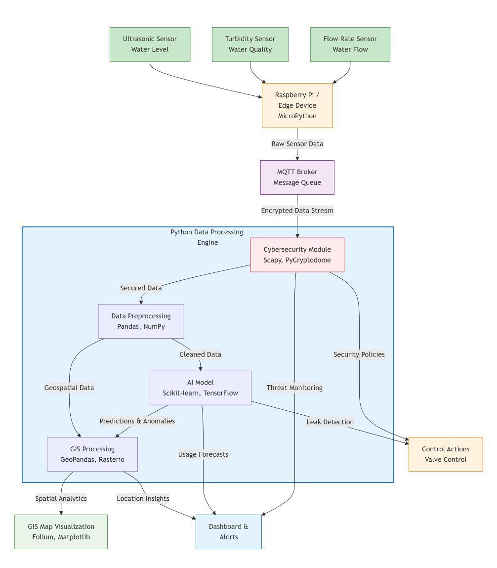 GISMapping:LibrarieslikeGeoPandasandFoliumtransform raw sensor data into interactive spatial visualizations, enabling decision-makers to monitor water distribution geographically.