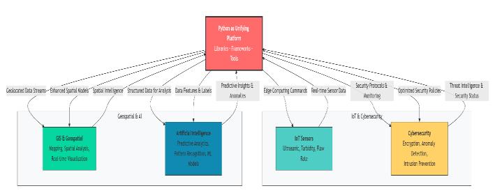 OneofPython’smostdefiningstrengthsliesnotonlyinits impact within individual domains but also in its ability to integrate multiple technological paradigms into cohesive, interdisciplinary solutions. By acting as a unifying layer across Artificial Intelligence (AI),Internet of Things(IoT), Geospatial Information Systems (GIS), and Cybersecurity, Python enables the creation of complex, intelligent, and securedigitalecosystems.