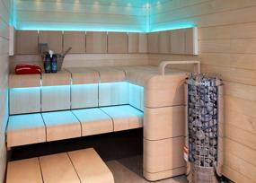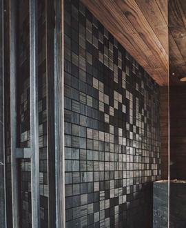 In saunas that expect a lot of water on the floor, be sure to add integrated tile baseboard around the perimeter to prevent water from migrating into the walls.