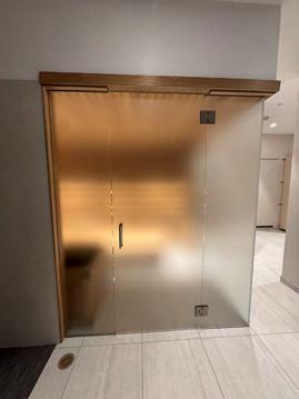 A clean, modern glass door that allows light to pass through while maintaining a simple, timeless look.