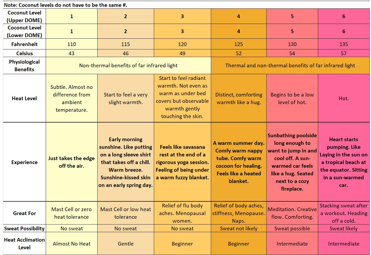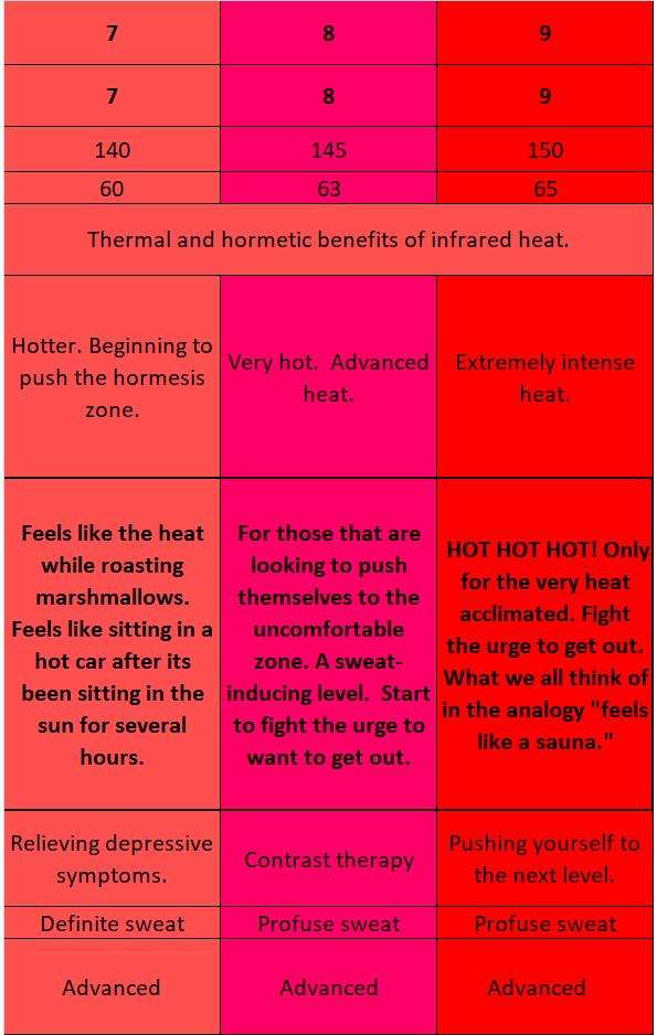 This spectrum is designed as a guide to help Solo users understand and find the experience they desire. It is not an exact science; each body uniquely responds to heat, so listen to your body and adjust. Start low and slow and work your way up to 40 minutes as a goal. A minimum of 15-20 minutes is recommended to receive optimal health benefits, along with regular use over time.