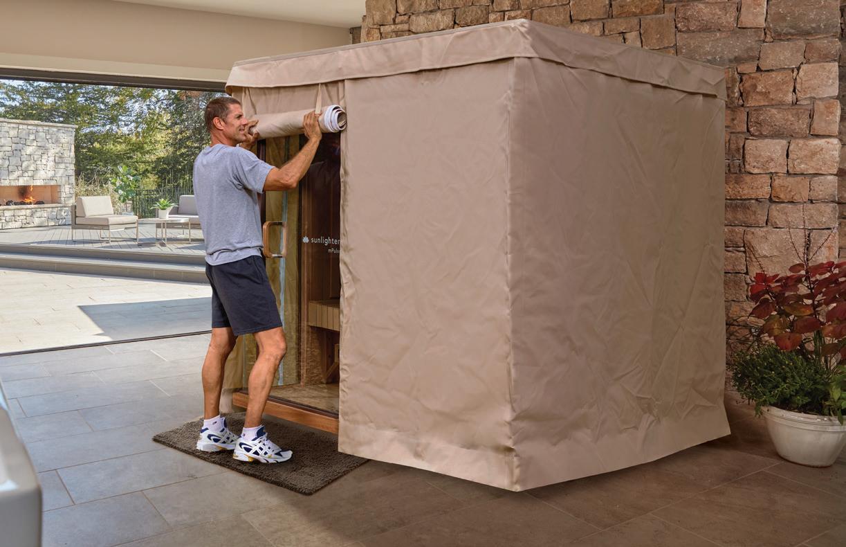 Our custom-made, water-resistant sauna covers are crafted from durable commercial fabric, perfect for outdoor use. They protect your sauna year-round, maintain your warranty, resist fading, and are easy to clean with mild soap or bleach for tougher stains.