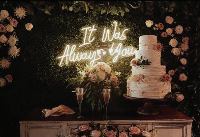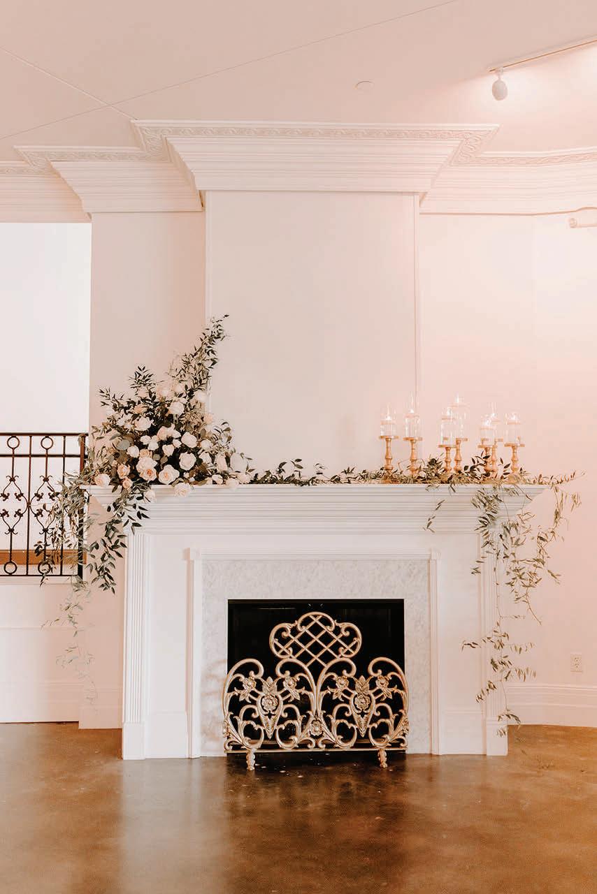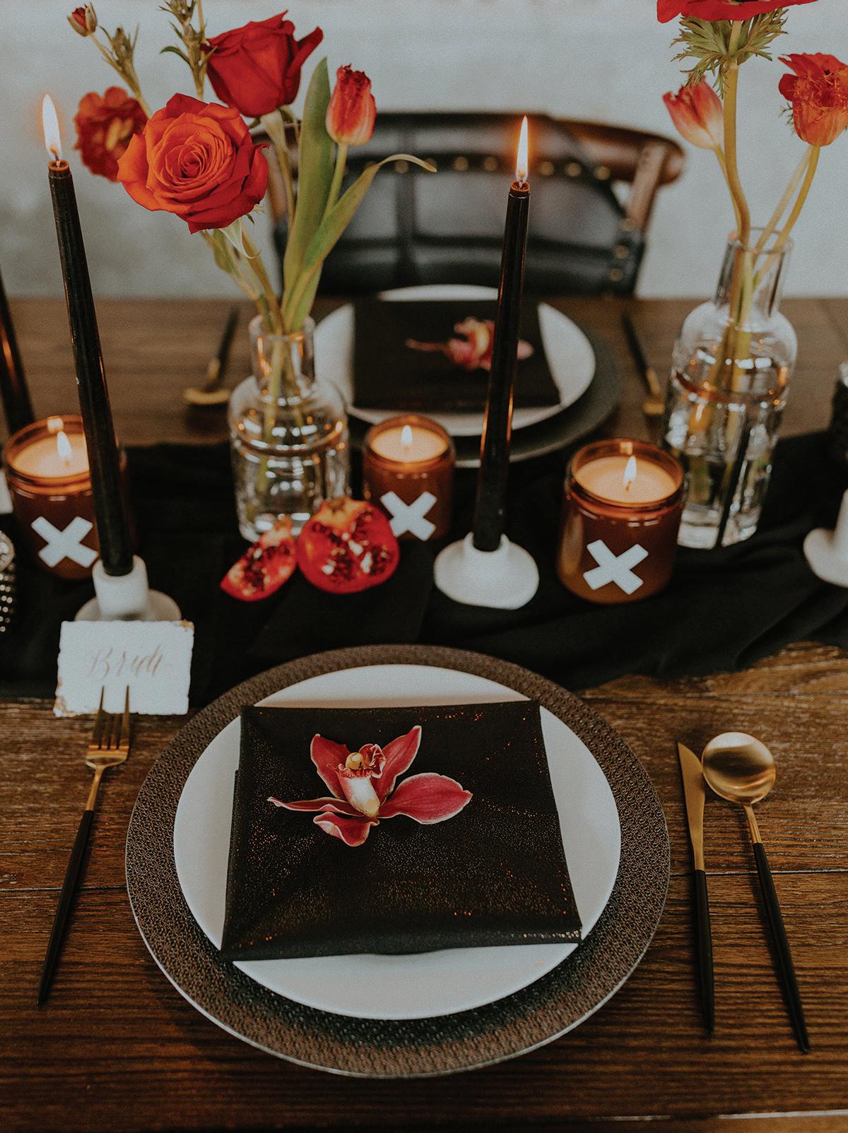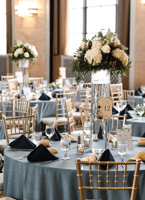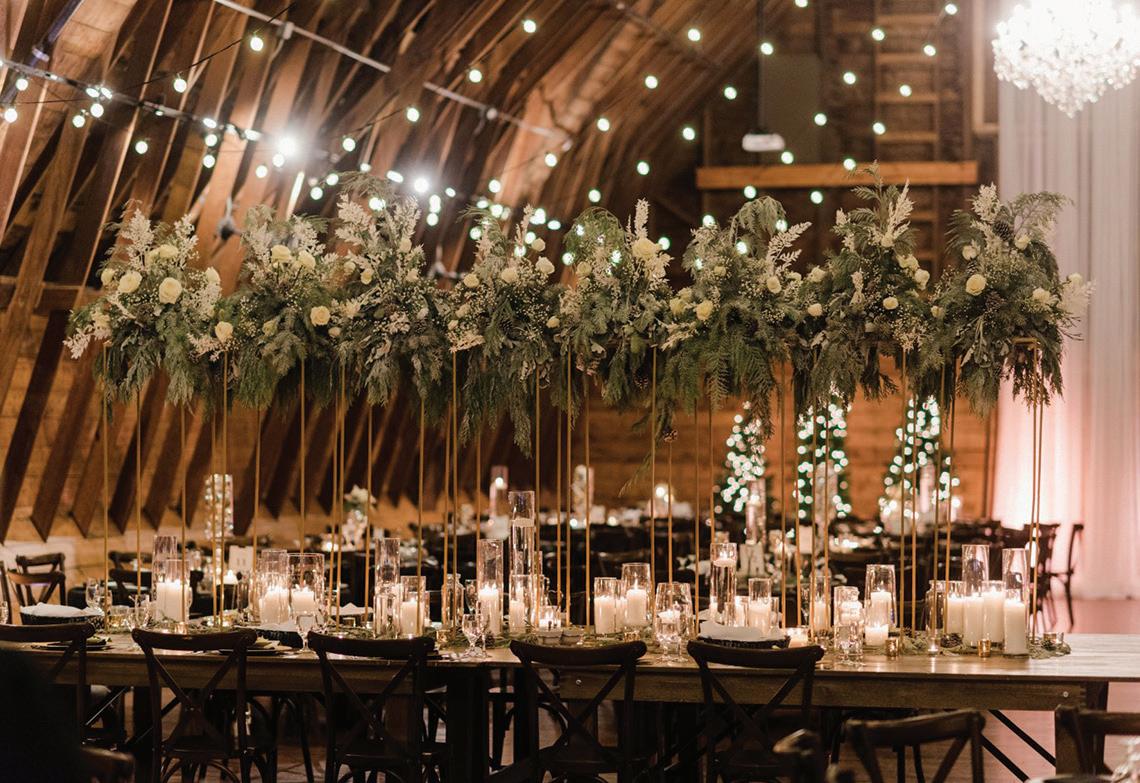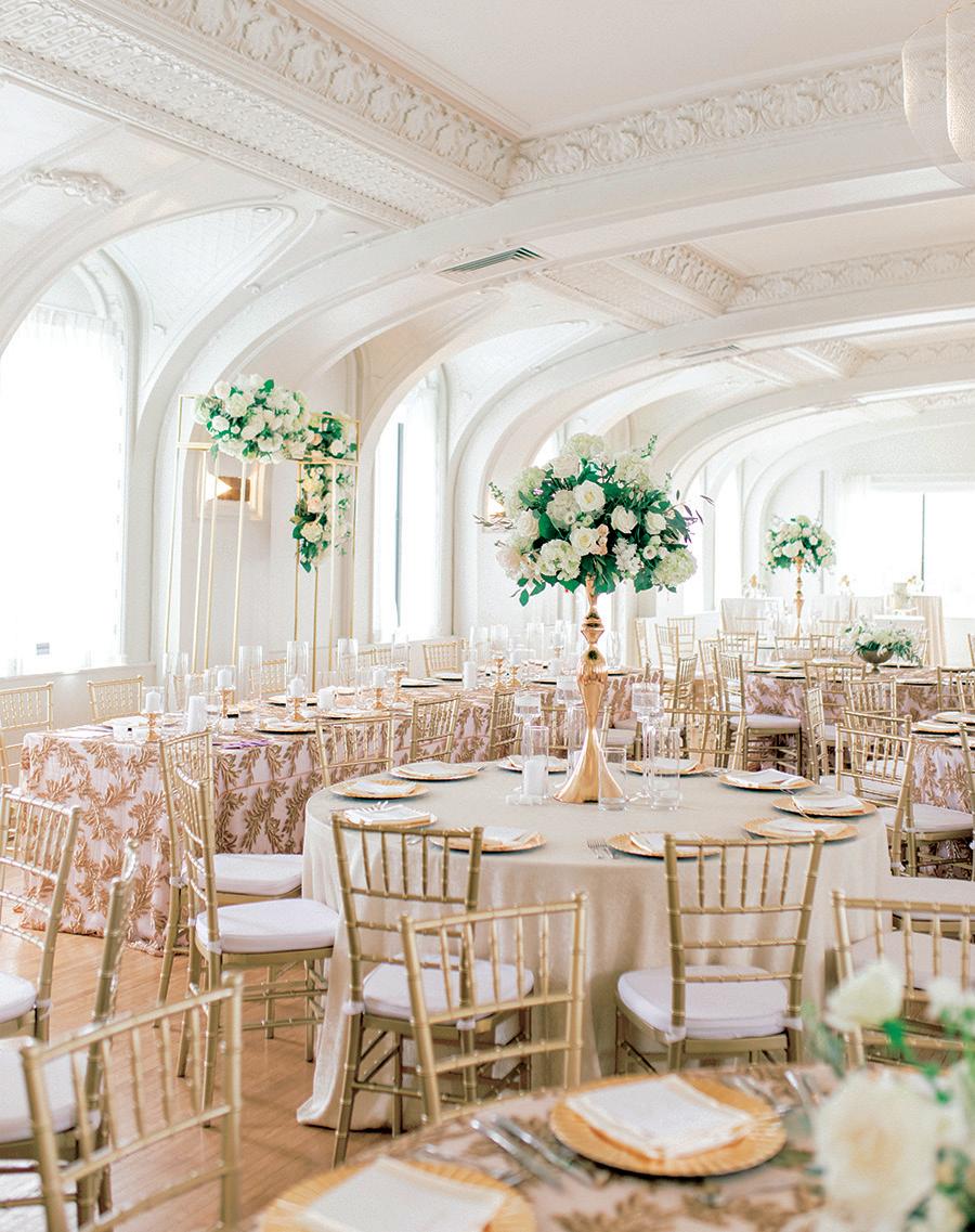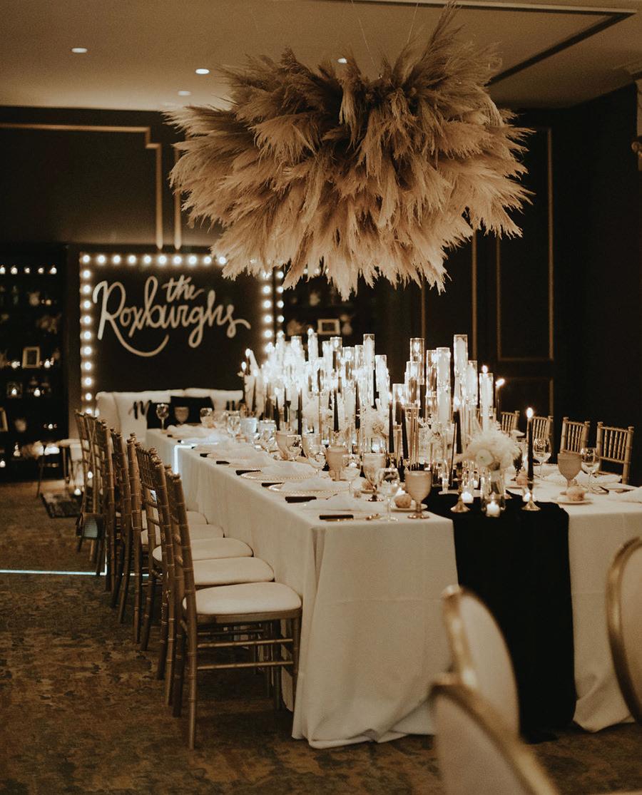 In this sophisticated soirée at Happy Hollow Club, Andrea Zahourek, the owner and creative director of AZ + Co, proves that a black and white theme doesn’t have to be boring. Zahourek softened the timeless color palette with luxe glimmers of gold and the warm glow of marquee and twinkle lights. A head table with a lavish arrangement of candles and a lush cloud of pampas grasses floating above it topped off the design with abundant flair. @az_co_events_design, @jeffreyolsonphotography