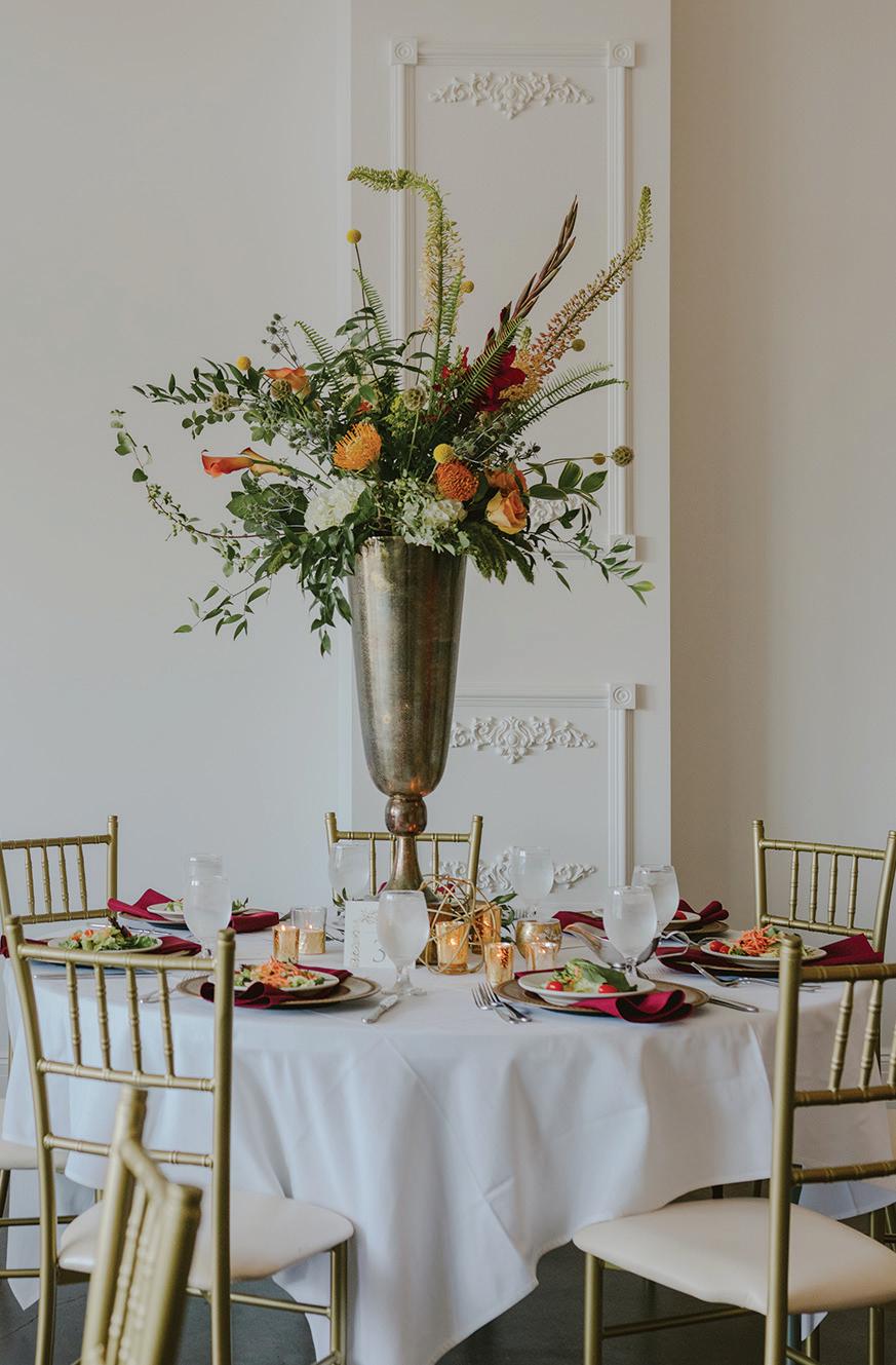 A striking autumn-inspired palette makes the most of botanicals in the Zinc Lounge at the Holland Performing Arts Center.
