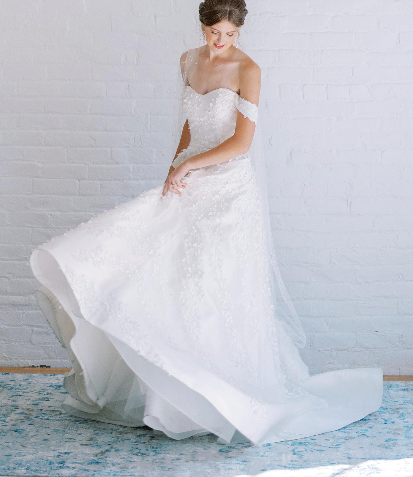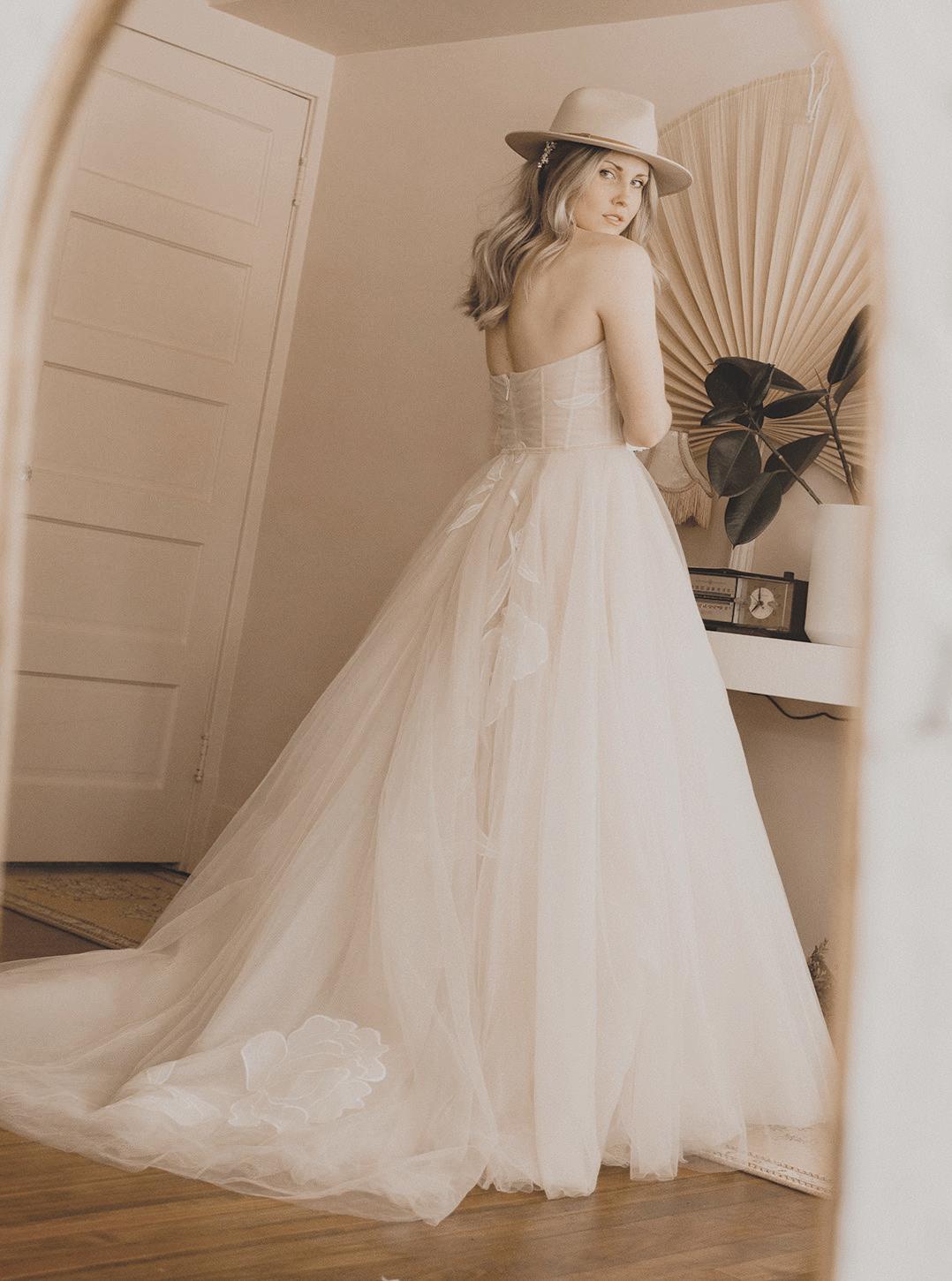 Looking simply sublime on her big day, bride Elaina Knowles wears the exquisite “Taylor” gown by Lee Petra Grebenau. This strapless corset gown is the epitome of glamour with its unique allover beaded lace, sweeping train and matching detachable choker. Knowles found the gown while on vacation in Miami, and says “The moment I tried it on, I knew I would never be able to wear something this cool again.” @elaina.lacy, @meghansavagephoto