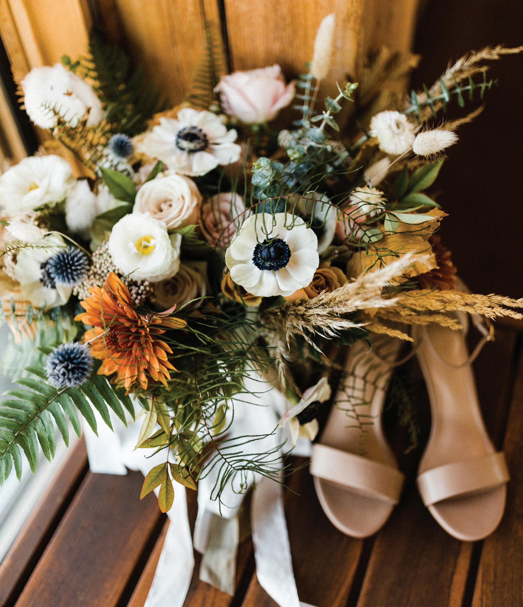 The “Kahlo” gown by Vagabond Bridal, available at A&Bé Bridal in Portland. Bouquet by Bixby and Pine. Hair and makeup by Northwest Makeup and Hair. Captured by DavidAnn at Cannon Beach. Additional details on page 15.