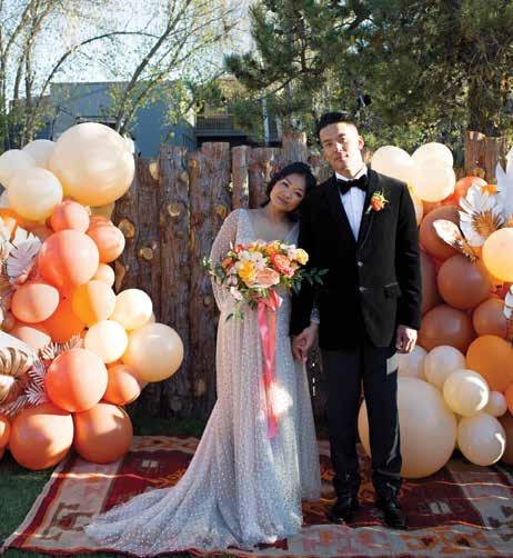 The pool area served as the ceremony site, where an altar of sunset-hued balloons and mismatched rugs lining the aisle turned up the hippie vibe. Hand-painted metallic leaves added a modern element for the “I dos.” Inside at the hotel’s cantina, the venue for the reception, The Posie Shoppe introduced tropical elements to the floral arrangements. Striking bird-ofparadise, shiny pink anthurium and bright roses served as stunning contrast to the jade glassware and lime-green taper candles, with orange metal chairs tying the entire tablescape together. Vinyl 45-rpm records were reimagined as candleholders, adding a touch of campiness to the scene. Alyson of Wild Folk Flower Apothecary crafted botanical cocktails served in ’70s-style green glasses, which complemented the fondue for two served from a custom-painted caquelon. “We believe that just because a wedding is small does not mean the details have to be overlooked,” says The Indigo Bride’s Alisha Reicks-Sturgill. “In fact, having an intimate wedding means you can let your creativity go wild. And you can soak in every moment of your stress-free wedding celebration.”