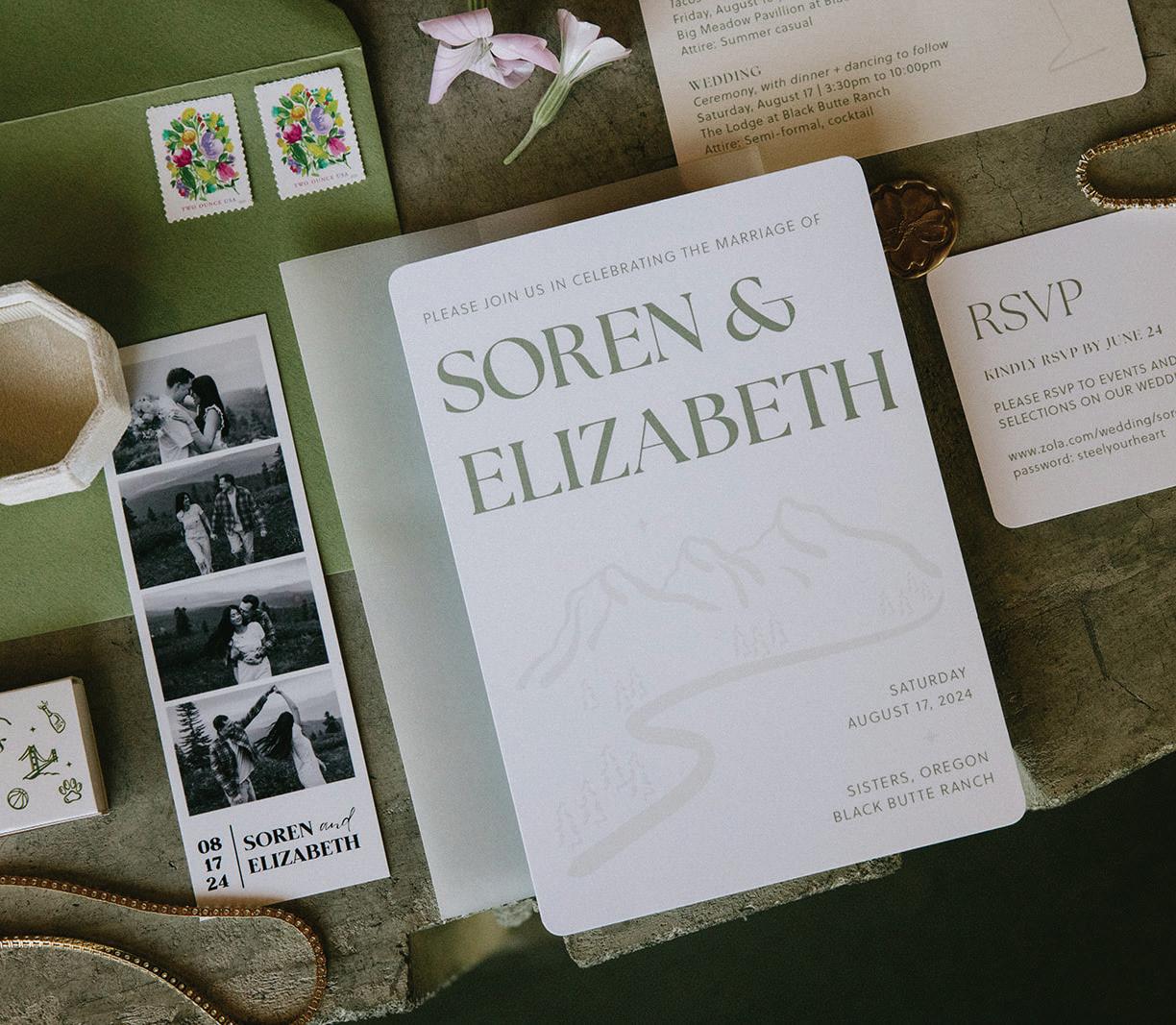 Elizabeth Wong and Soren Steelquist’s love story began at the University of San Francisco, where they met while playing on an intramural basketball team. The two quickly bonded over their shared love of the outdoors, and their story blossomed from there. It’s no wonder that, as outdoor enthusiasts, they chose scenic Black Butte Ranch to host their wedding celebration. The ceremony was held at the edge of the lake at Black Butte’s lodge, which served as a charming backdrop in a stunning natural setting. Their wedding design featured bold and vibrant colors, while personalized touches—such as customized napkins and an appearance by their pup, Thor, as the ring bearer—imbued the celebration with authenticity. Another sweet moment was when the couple surprised their guests with ice cream sandwiches and local gelato after dinner. The couple embraced local garden flowers in the day’s floral arrangements, such as cosmos, scabious, zinnias, rudbeckia and dahlias, in shades of blush, white, mustard and rusty orange. For her dress, Elizabeth chose a sophisticated floor-length gown, which was complemented by her bridesmaids’ colorful picks. Elizabeth and Soren will always remember their special day, and so will their guests. —Jenny Castro