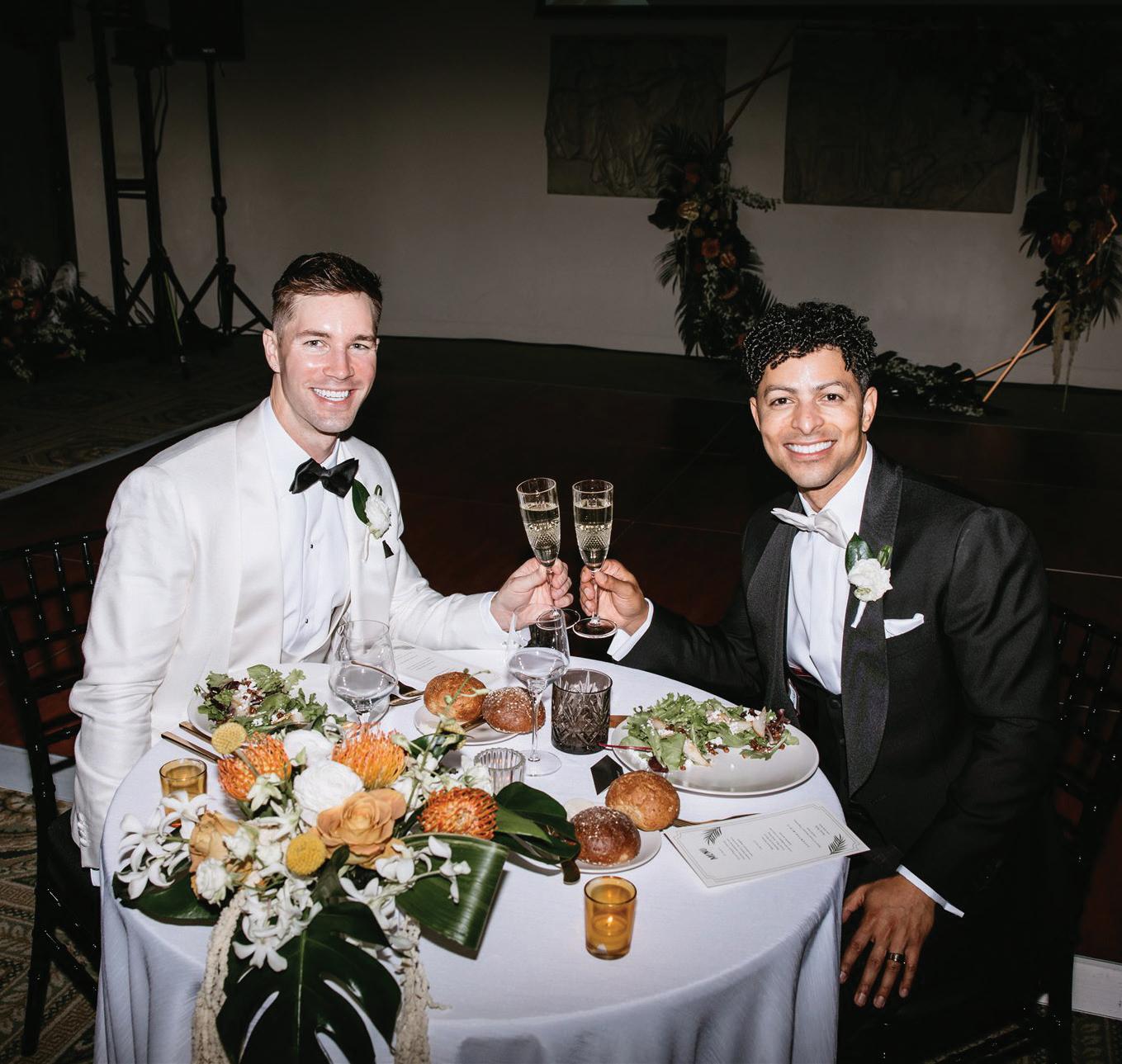 Omar and Will celebrated their wedding at the Portland Art Museum’s “sunken ballroom” (Fields Ballroom). Their celebration paid homage to the Golden Age of Hollywood, with a black-tie dress code, exotic floral arrangements, sparkling candles and elegant glassware. A fun take on the traditional reception included disposable cameras at each table, allowing guests to capture candid moments throughout the evening. The couple and their wedding party also treated everyone to a choreographed dance, heightening the festivities. The décor featured vibrant colors, with golds, oranges and shades of peach fuzz taking center stage, and greens and reds creating a tropical ambiance. Among the unique moments during the reception were the viewing of a video montage with personalized messages from the wedding party, as well as a special appearance by the couple’s parents. Glow sticks were given to guests during the party, the perfect accessory for dancing to the disco-inspired music. The event was unforgettable, with personalized touches that left guests amazed. The night concluded with a sparkler send-off, capping off an epic dance party. —Jenny Castro