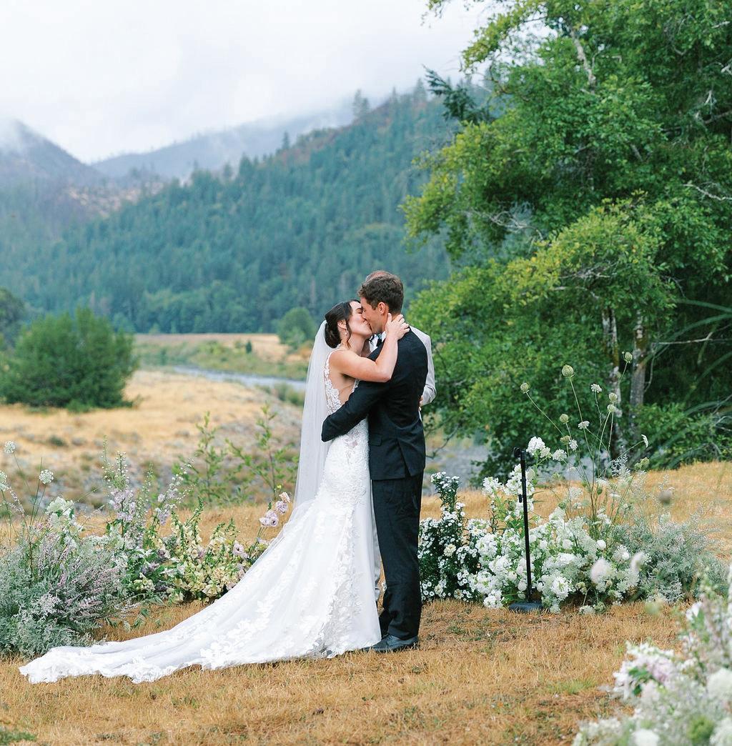 Riley and Stewart met while on a blind date on New Year’s Eve. Their relationship blossomed, and the couple held their wedding at a lovely home in southern Oregon, which is surrounded by mountain views, lush Oregon foliage and the Illinois River. The couple’s wedding aesthetic was filled with romance and comfort, while highlighting the ranching and forestry backgrounds of the bride and groom. As the evening set in, the lighted white tents accented the surrounding trees and foothills, making the setting all the more intimate. The floral design reflected a great attention to detail, with a light pink and white color palette combined with warm, earthy tones to create a refined ambiance. Special moments during the event included the role of one of the couple’s friends, the one who initially introduced the two, as the officiant, and the keeping of traditions such as the cake cutting private. Rounding out the overall vibe were the elegant fashion choices, with Riley looking gorgeous in an embroidered white V-neck gown, complemented by her bridesmaids’ beige silk dresses. A stunning and gorgeous wedding celebration, the party truly captured the essence and mood of the Pacific Northwest, with elements of rain, mist, unmatched scenic views and the beauty of nature. —Jenny Castro