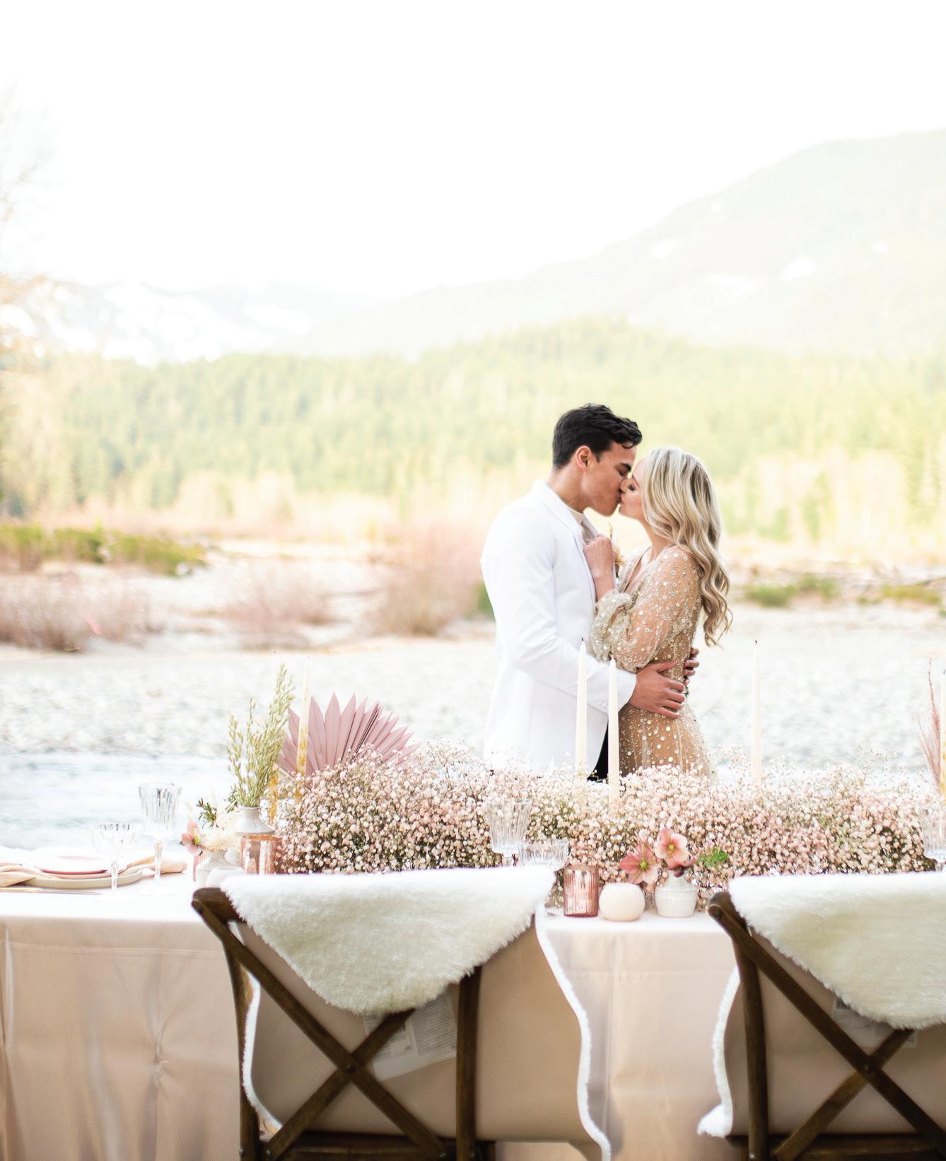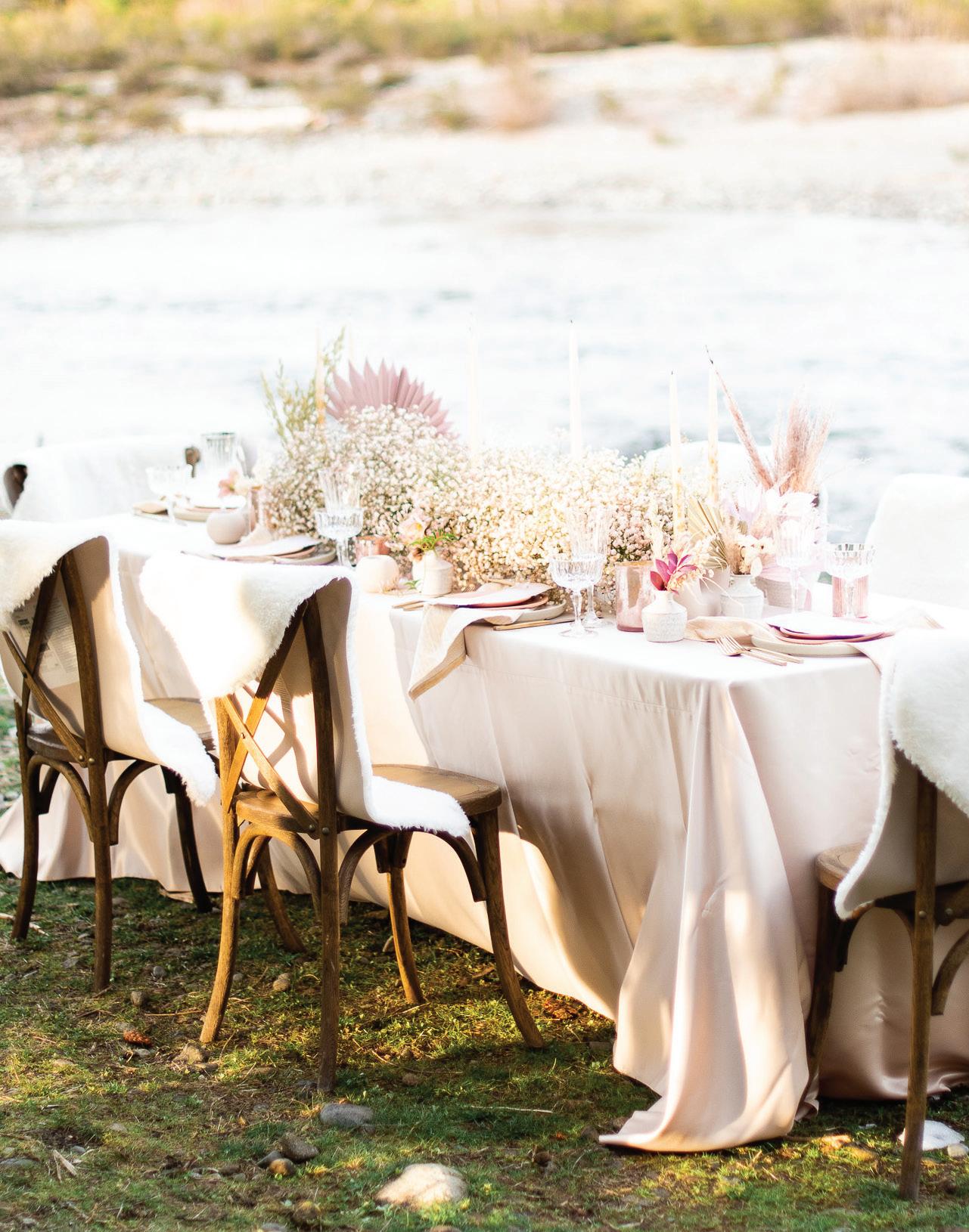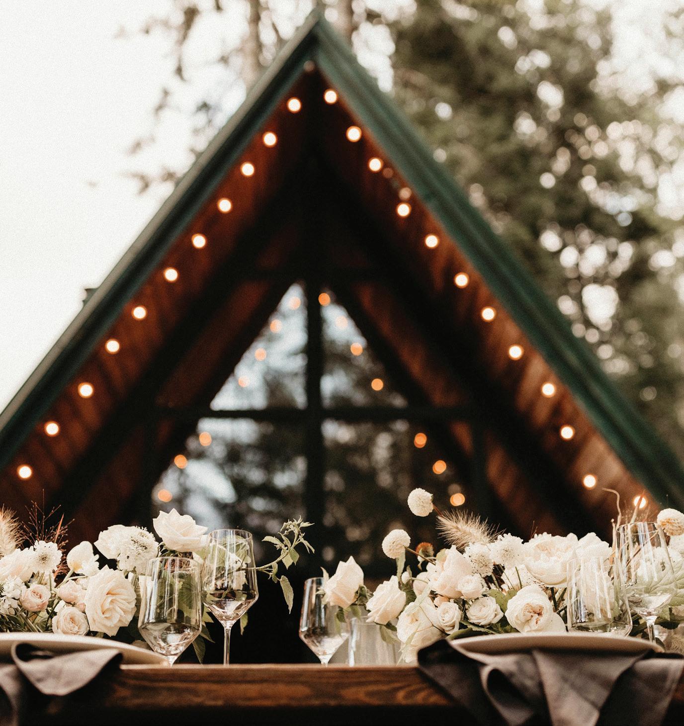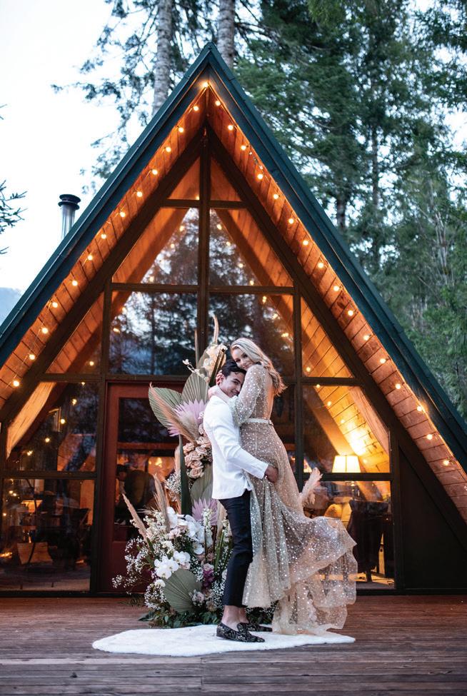 Soft, warm tones, celestial accents and romantic florals set the stage for nuptials at a cozy A-frame cabin along the Cowlitz River.