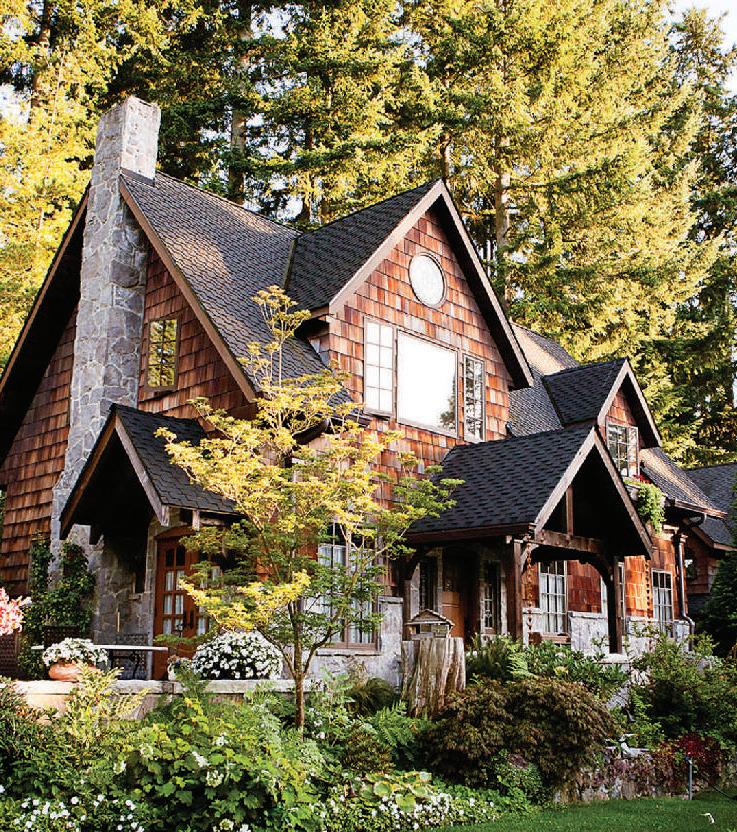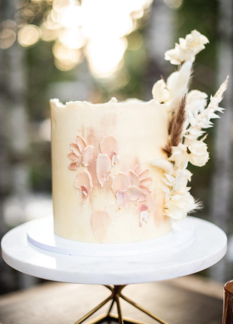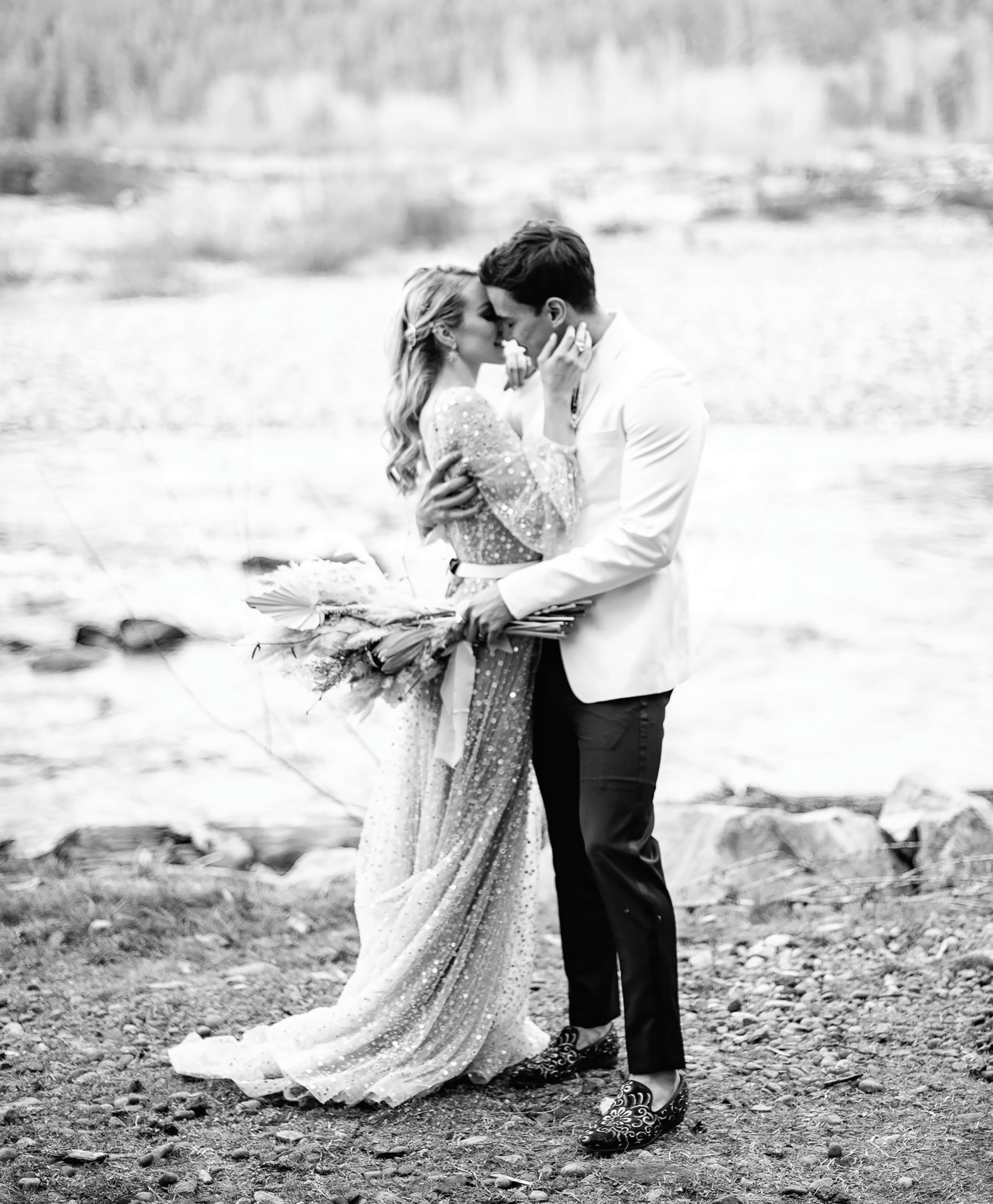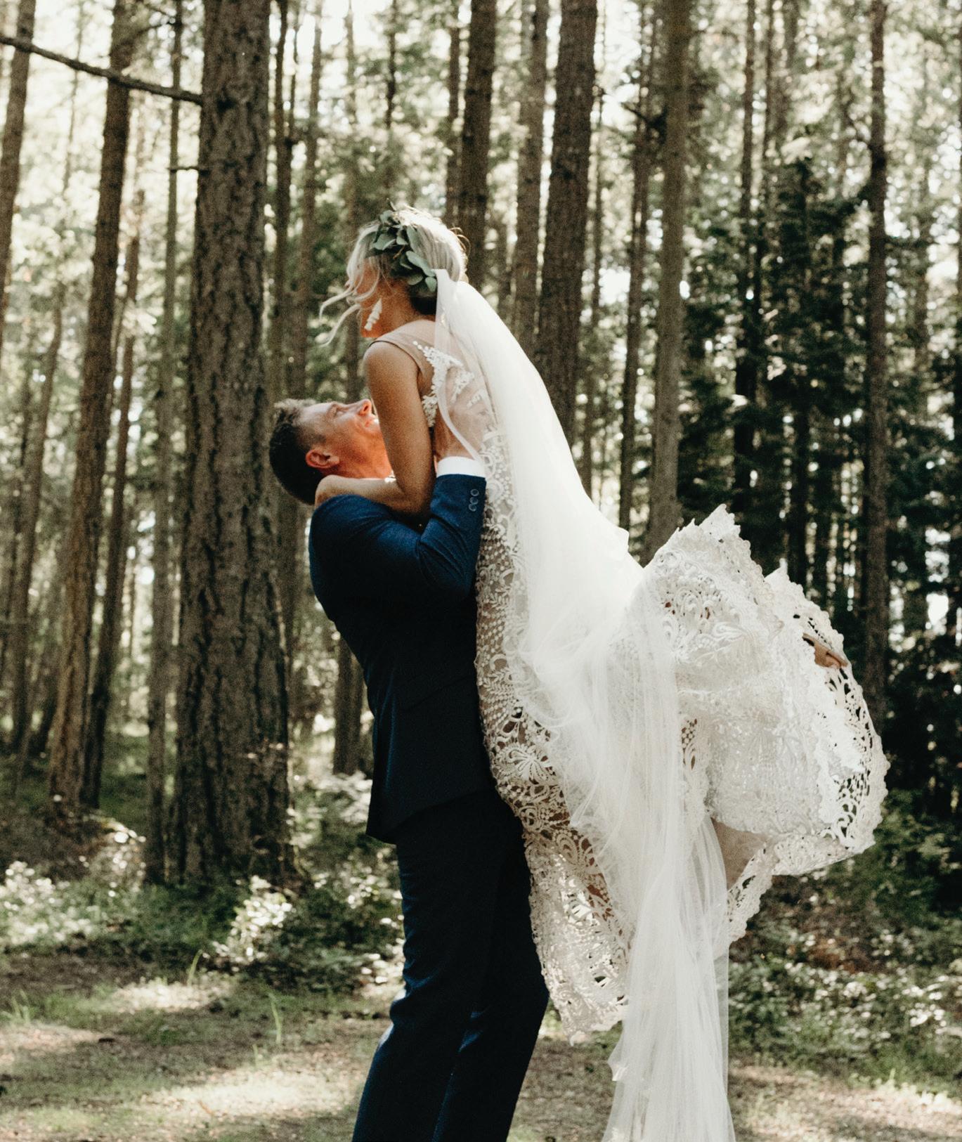 Soft, warm tones, celestial accents and romantic florals set the stage for nuptials at a cozy A-frame cabin along the Cowlitz River.