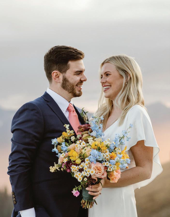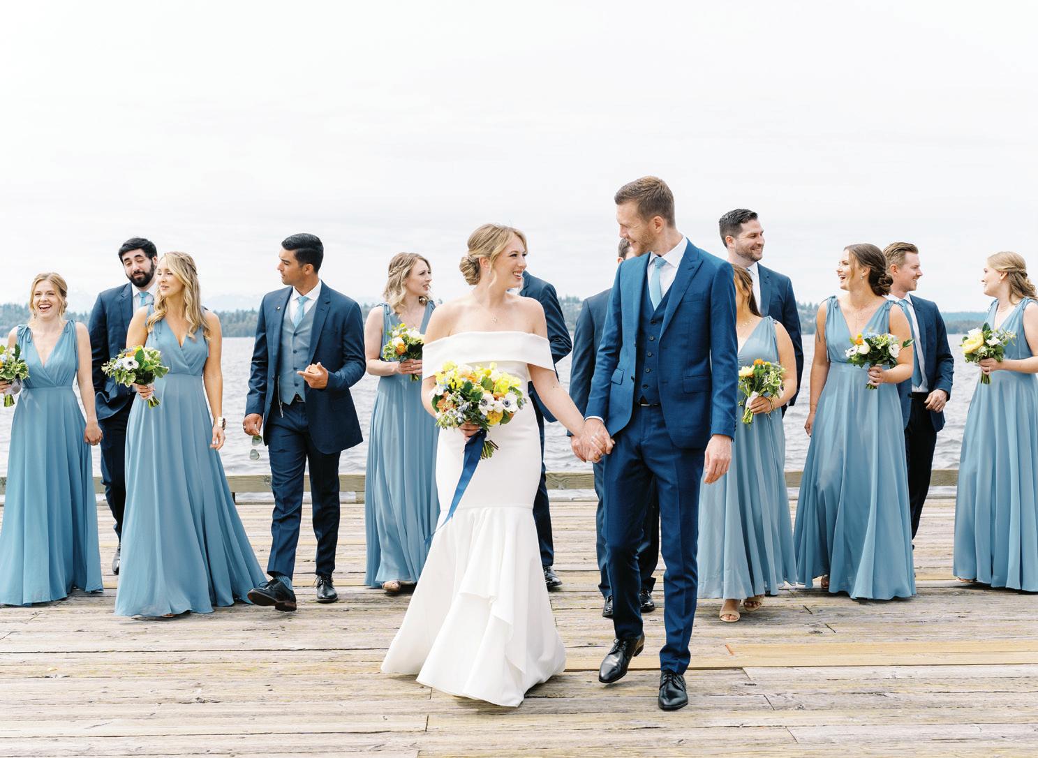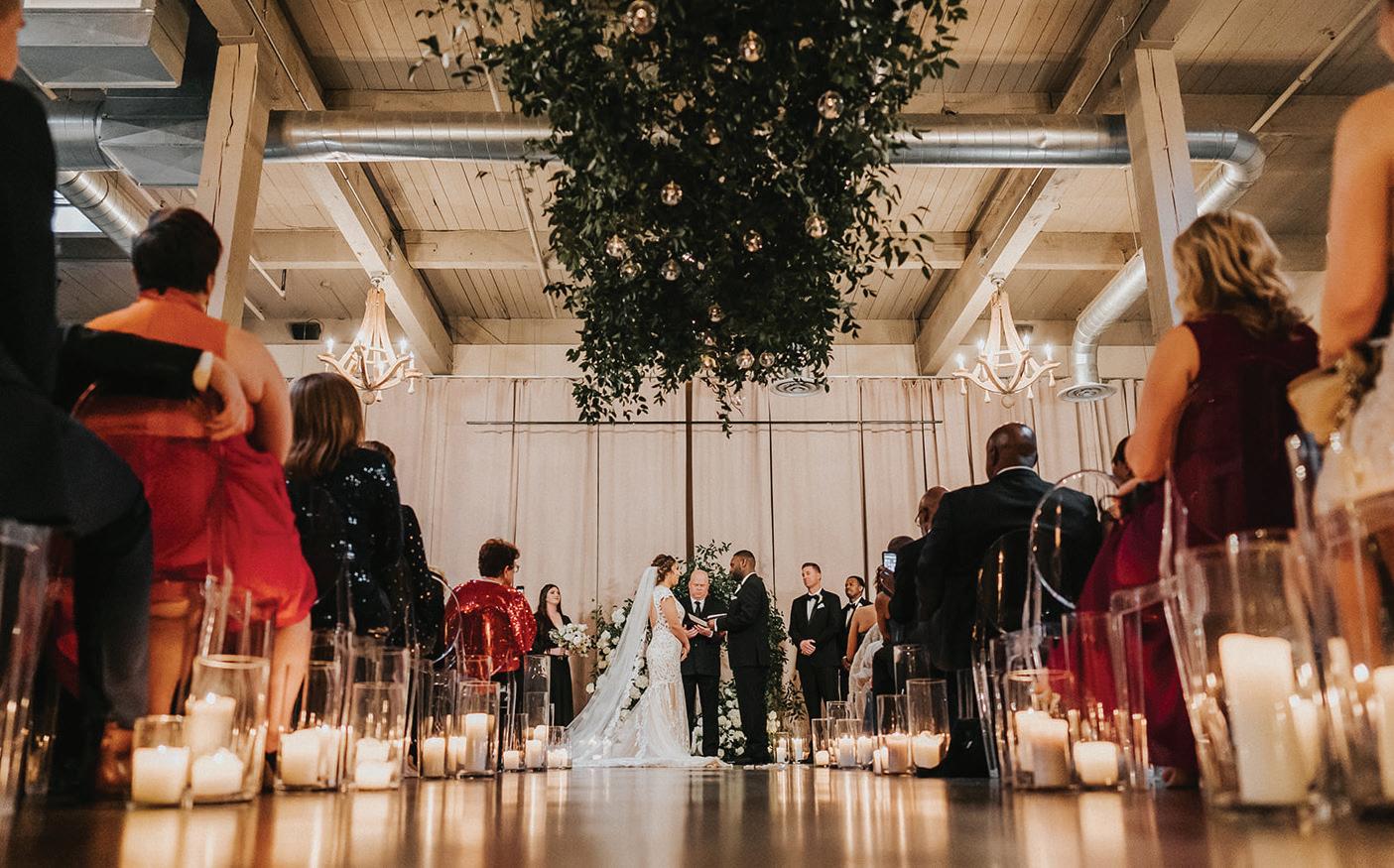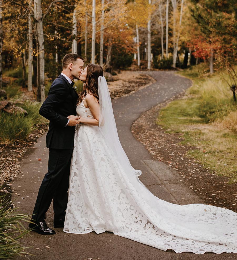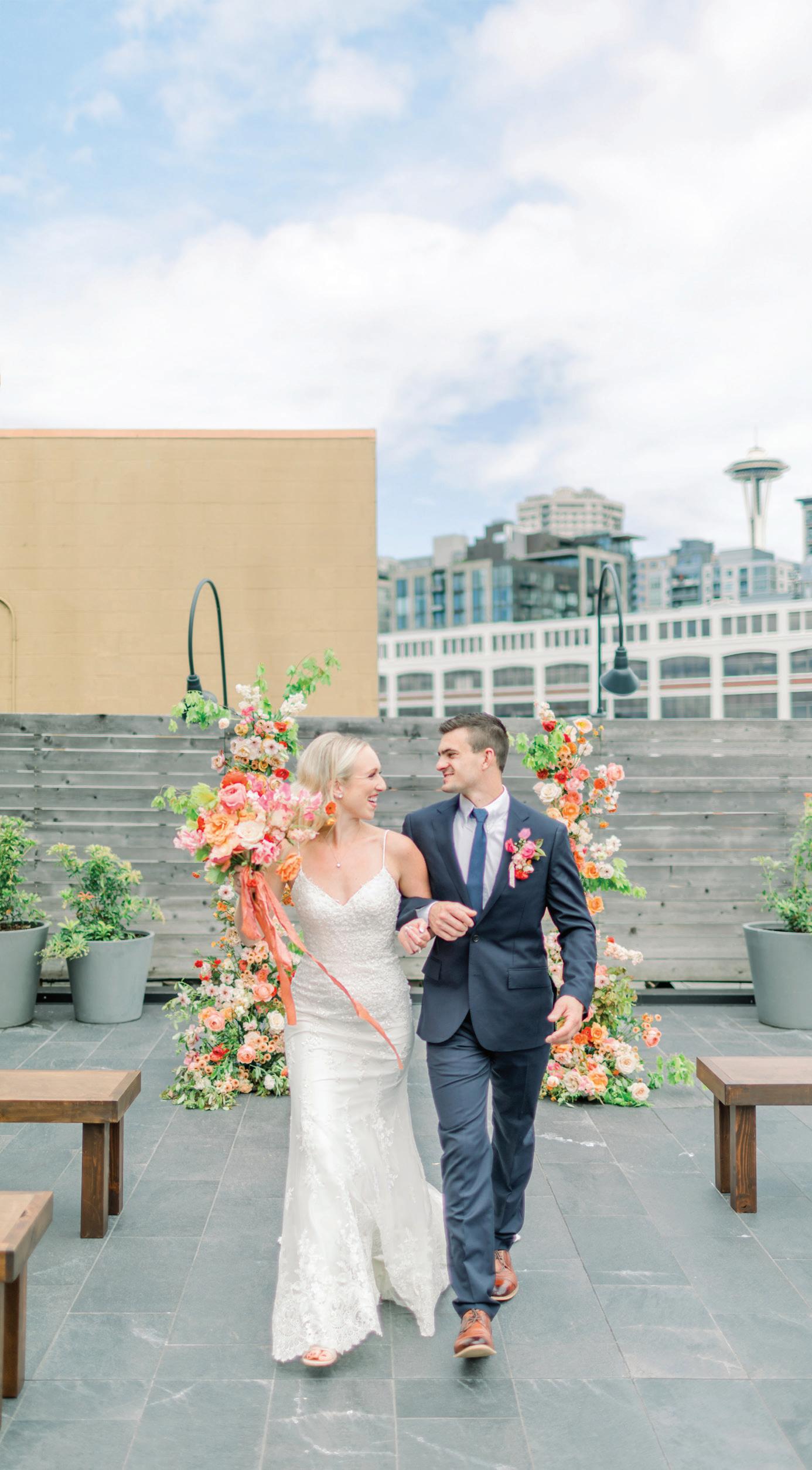 Wedding bells were originally planned to ring for Erin Haefs and Peter Rifel in Maui, but while on a summer road trip, the two decided there was no point in waiting any longer. The two fell in love in the Emerald City, so having a Seattle-based celebration was not only more convenient, but also more authentic to their story. Erin and Peter stayed at Thompson Seattle during their wedding weekend and had their first look on the hotel’s roof. Wearing a Madison James off-the-shoulder sheath gown featuring a champagne-hued underlay and lace appliqués, Erin was the picture of classic elegance—as was Peter in a classic black tuxedo. The fall wedding naturally called for an autumnal theme, and included an apple-pie shot escort wall, rose quartz velvet linens, and an ombre floral arch in shades of bronze, dusty rose, chocolate and burgundy. Music is important to Erin and Peter, and Brooklyn Duo—a Washington-based cello-piano duo known for its classical covers of pop songs—met the couple’s every expectation. There was also no shortage of gastronomical treats for guests to enjoy. Happy hour featured smoked salmon and honeydew canapés, bite-size grilled cheese and tomato bisque shooters, which guests noshed on while taking in the views of Mount Rainier. Dinner was a family-style Italian affair with spaghetti and meatballs, chicken Parmesan, and roasted garlic and mascarpone mashed potatoes. A night of dancing under the full moon was capped off with the bride’s and groom’s favorite desserts: individually plated crème brûlée and molten chocolate cake.