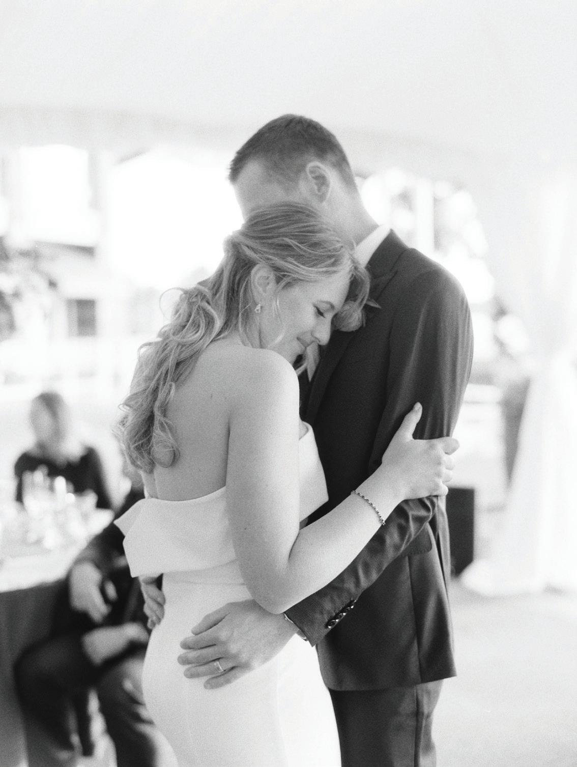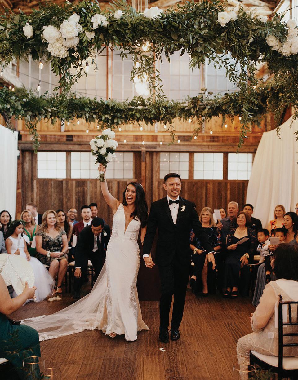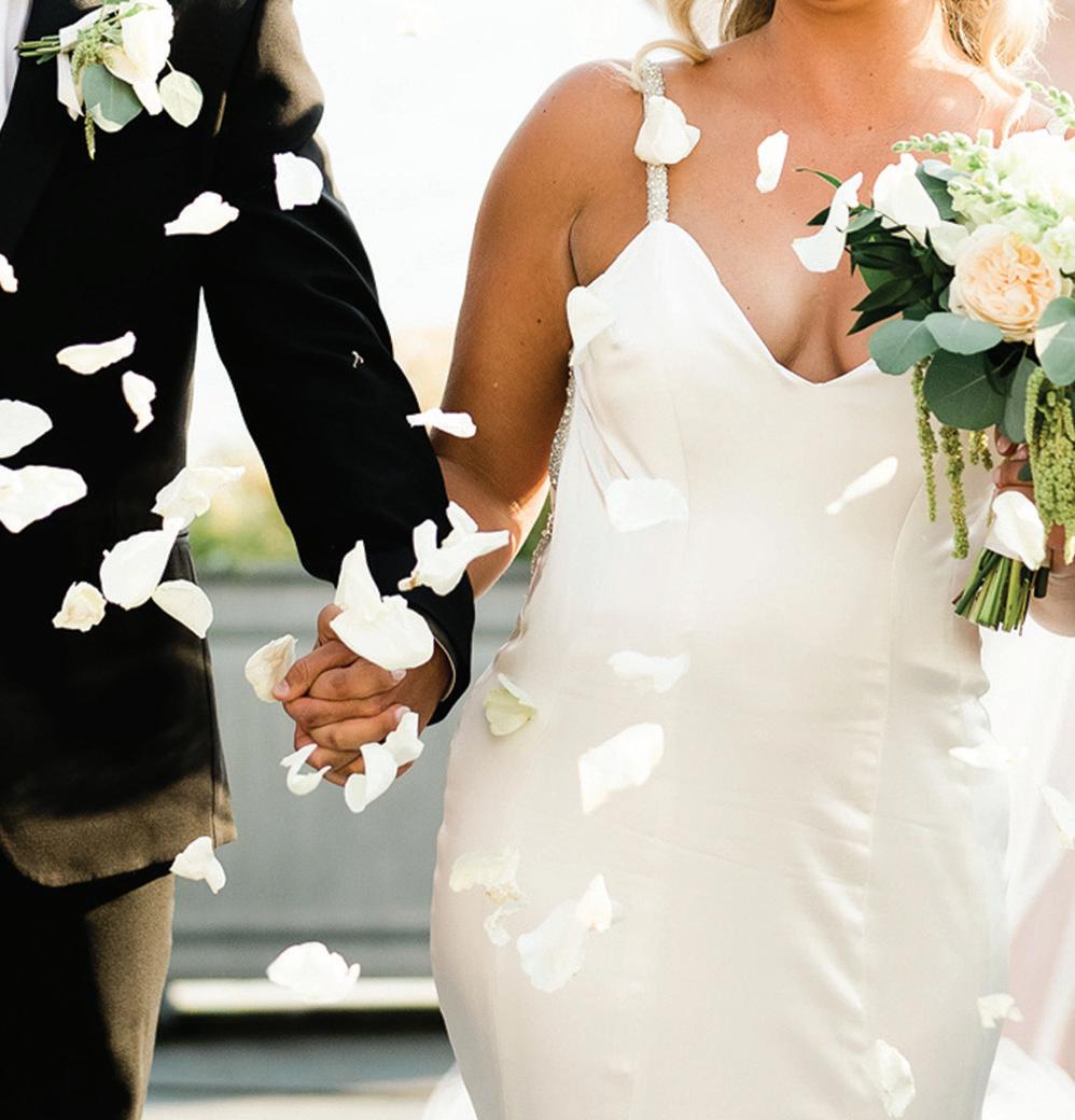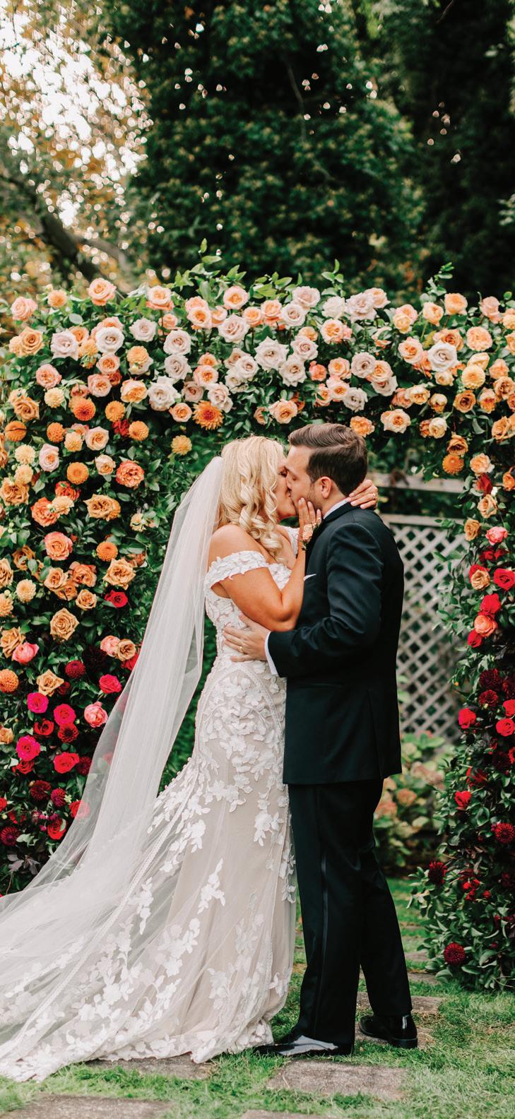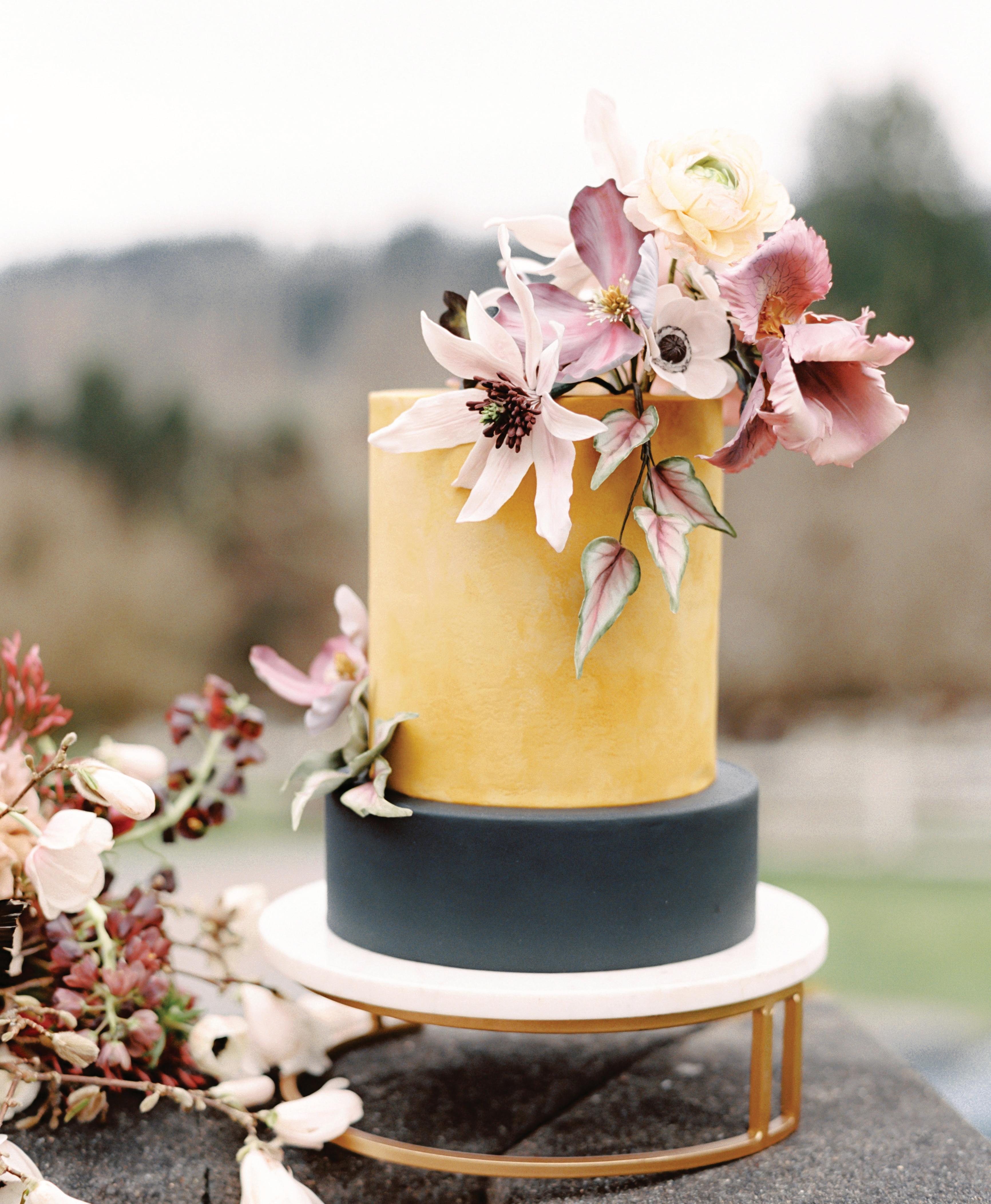 Wedding bells were originally planned to ring for Erin Haefs and Peter Rifel in Maui, but while on a summer road trip, the two decided there was no point in waiting any longer. The two fell in love in the Emerald City, so having a Seattle-based celebration was not only more convenient, but also more authentic to their story. Erin and Peter stayed at Thompson Seattle during their wedding weekend and had their first look on the hotel’s roof. Wearing a Madison James off-the-shoulder sheath gown featuring a champagne-hued underlay and lace appliqués, Erin was the picture of classic elegance—as was Peter in a classic black tuxedo. The fall wedding naturally called for an autumnal theme, and included an apple-pie shot escort wall, rose quartz velvet linens, and an ombre floral arch in shades of bronze, dusty rose, chocolate and burgundy. Music is important to Erin and Peter, and Brooklyn Duo—a Washington-based cello-piano duo known for its classical covers of pop songs—met the couple’s every expectation. There was also no shortage of gastronomical treats for guests to enjoy. Happy hour featured smoked salmon and honeydew canapés, bite-size grilled cheese and tomato bisque shooters, which guests noshed on while taking in the views of Mount Rainier. Dinner was a family-style Italian affair with spaghetti and meatballs, chicken Parmesan, and roasted garlic and mascarpone mashed potatoes. A night of dancing under the full moon was capped off with the bride’s and groom’s favorite desserts: individually plated crème brûlée and molten chocolate cake.