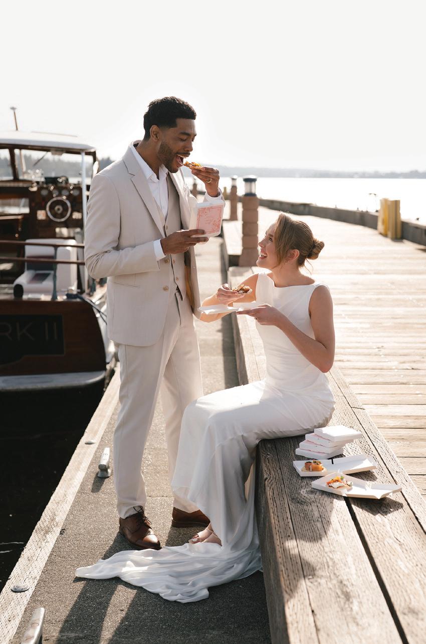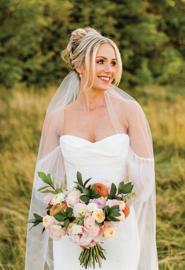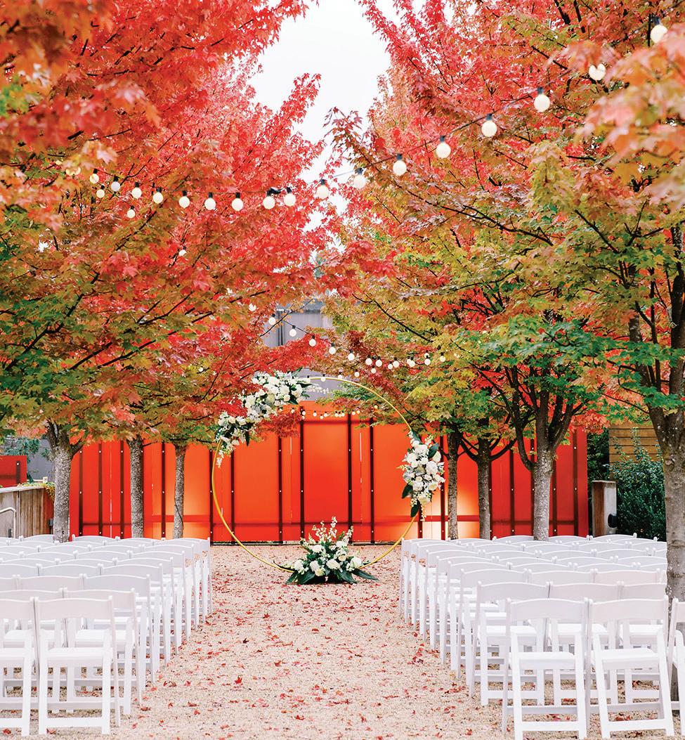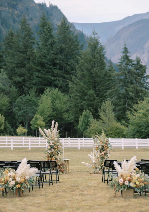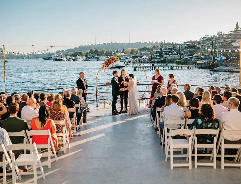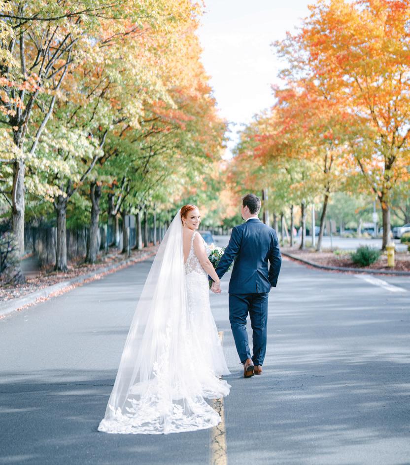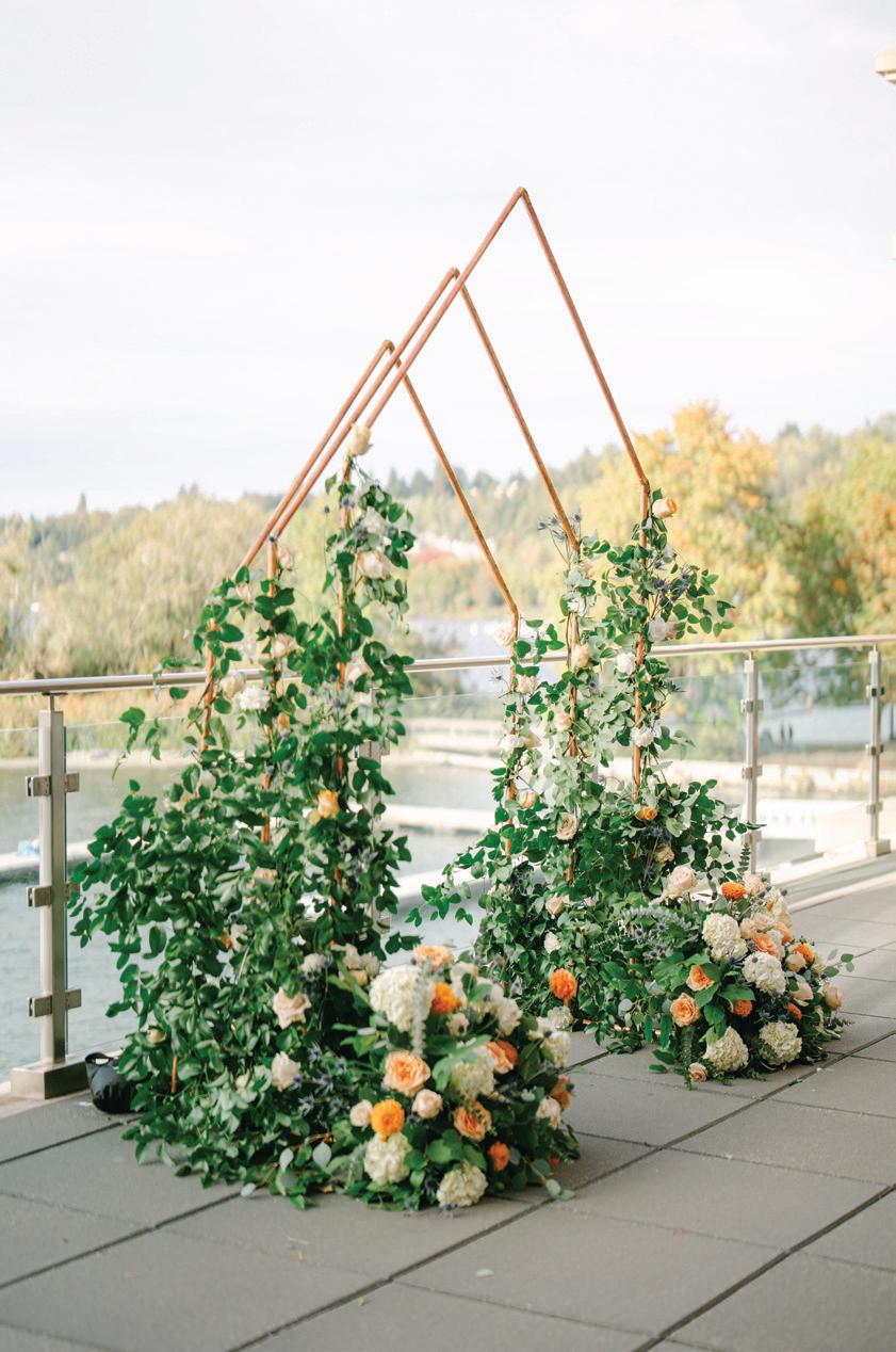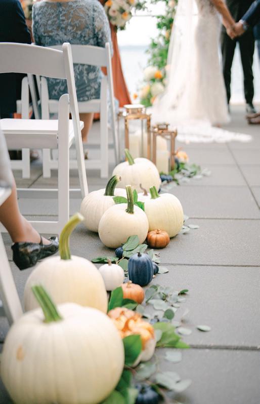 Fall was in the air at Brittany and Dustin’s October wedding in Seattle. Brittany’s vision board included a breathtaking view and a venue that would leave a lasting impression—as well as a refined approach to seasonal style. The Hyatt Regency Lake Washington was the perfect location, with its waterfront setting providing the ideal backdrop. Initially, Brittany was leaning toward traditional autumn-hued oranges, but the bright colors didn’t match her vision. A sense of elegance and timelessness was achieved with her choice of a soft palette of blush, cream, peach and ivory. Creamcolored pumpkins sprinkled with copper glitter along with navy accents and seasonal blue thistle added a contemporary touch to the autumn elements. The result was everything Brittany imagined: sophisticated, harmonious and perfectly suited for their fall celebration. —Laura Cross